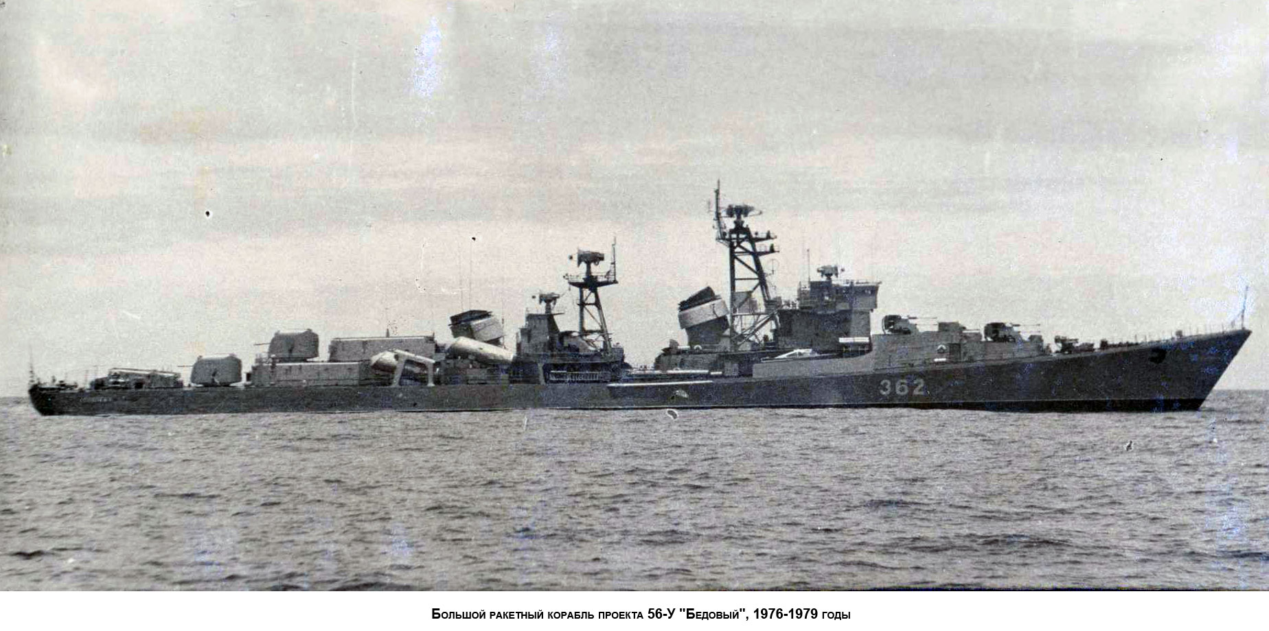 Большой ракетный корабль "Бедовый" строился первоначально как эсминец проект 56. Корабль 03.09.1952 г. был зачислен в списки кораблей ВМФ и 01.12.1953 г. заложен на заводе № 445 (заводской № 1204). Достраивался по проекту 56-ЭМ, спущен на воду 31.07.1955 г., вступил в строй 30.06.1958 г. и 30.07.1958 г., подняв Военно-морской флаг, вошел в состав ЧФ. "Бедовый" явился первым в ВМФ СССР кораблем, вооруженным противокорабельным ракетным оружием.