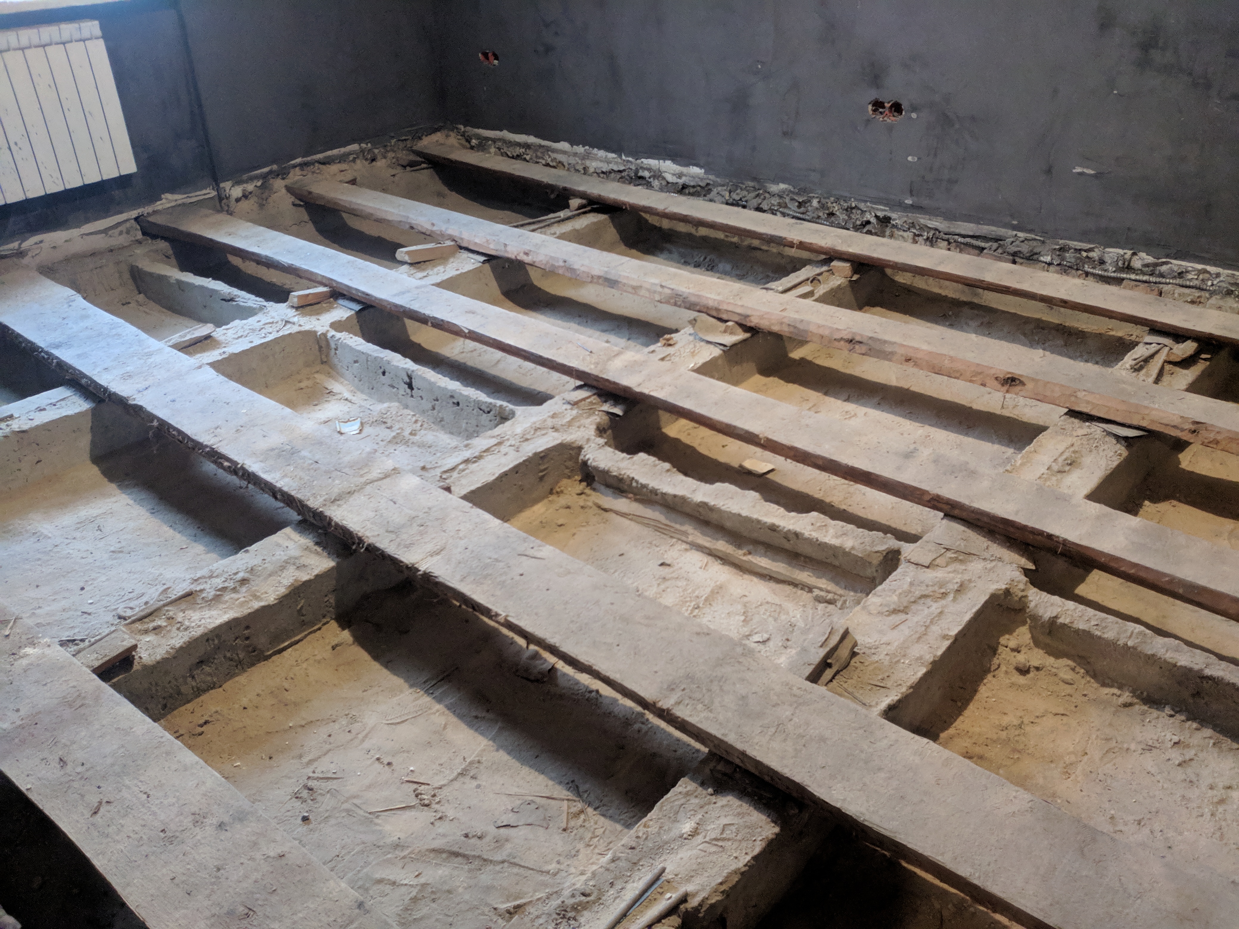 ). Там все было, включая асбест и заколосившуюся рожь. Даже серебрянную сережку нашли... Остались лаги, на них будем класть новую доску. Результаты вскрытия на фото. Возник вопрос. Лаги по уровню выводились (если это так можно назвать) клиньями, клинья кое-где были прибиты к лагам. Что не было прибито - выпало, образовав аномальные зоны, на которых слегка "штормило" даже по-трезвому.Вопрос - лаги будут выводится новыми подкладками (граб, он как-бы для этого предназначен). Технология такова, что грабовые опоры будут фиксироваться к бетонным ригелям специальным клеем. Следует ли эти опоры приклеивать к лагам, или оставлять лаги "плавать" на опорах? Черновой пол (сухая доска 60 настилом в притык) будет на лаги клеится для образования подобия цельного столярного щита. ПС За стены - это подложка на пару-тройку тона темнее, чтобы не было видно царапин и сколов финиша, просьба не пинать зря Конструктив поменять невозможно, изначально задача была сохранить аутентичный деревянный пол, упрочнив и усилив до приемлемых значений.