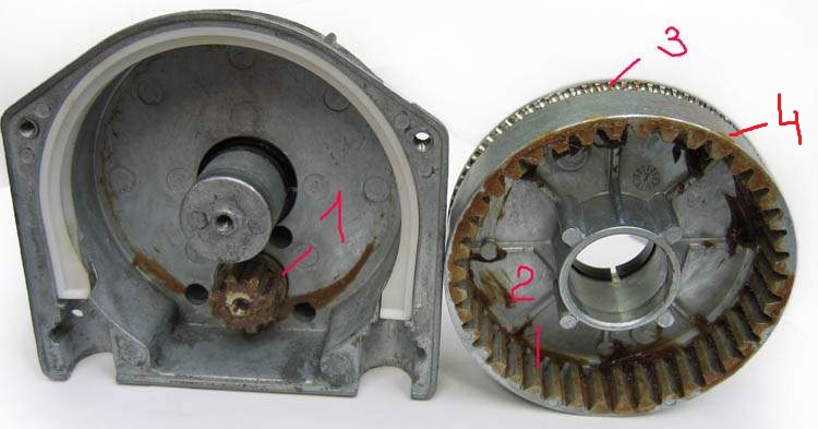 Возникла проблема с рулевым редуктором. Стал прокручиваться руль, когда крутишь против часовой стрелки. На малом газу работает лучше, на большом совсем никак.. Фото прилагаю (на фото не мой редуктор) Открутил заднюю крышку редуктора и при вращении руля стал смотреть. Шестерня 4 на фото не вращается, идут щелчки, такое впечатление что шестерня 1 прокручивается внутри. Сняв шестерню 4 не обнаружил слизаных зубов что на 1-й что на 4-й шестерни.... Вот такая байда, кто что скажет? Редуктору крышка?