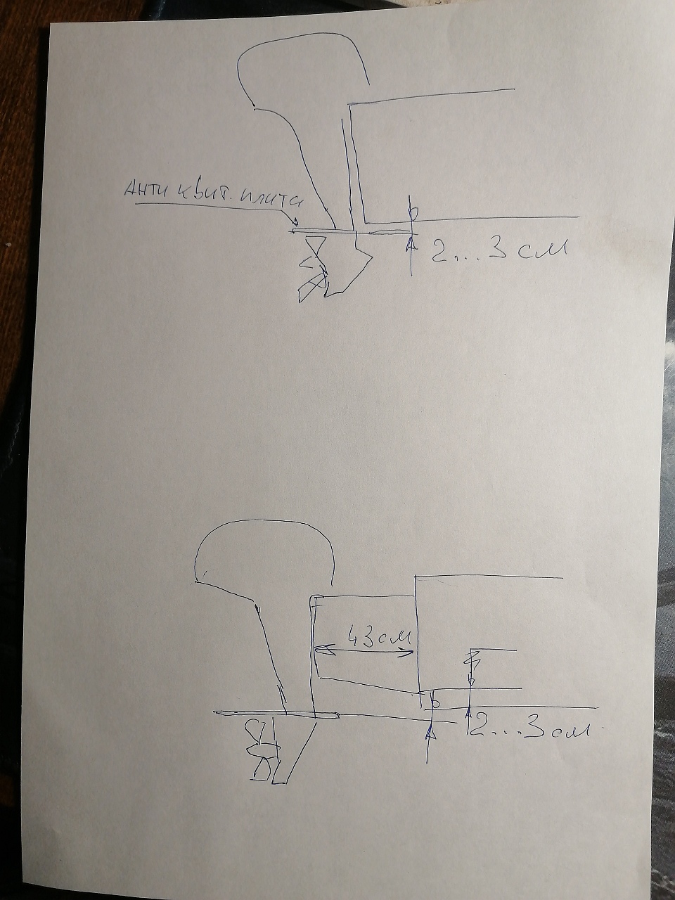 Казанка 5М установлен выносной транец, плита прим. на 3 см ниже днища, но это при стандартном транце, а как на выносном, мне тут сказали что должна быть выше, см. на 5