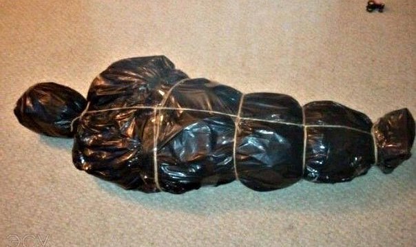 4. Выносить нужно с видимым усилием, оглядываясь по сторонам. С трудом перевалить в мусорный бак. Сказать "Фух".