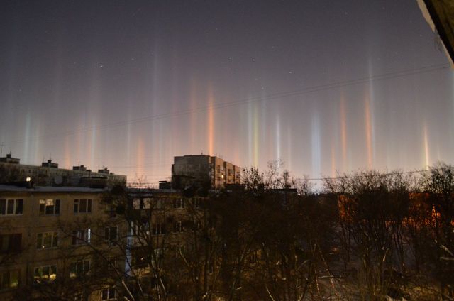 Сегодня ночью в Харькове наблюдалось "Северное Сияние"* - *Световые столбы - не частое явление , когда кристалики льда в воздухе отражают свет и получается вот такая красота .Возможно только при морозе и отсутствии ветра . Было снято в 3:00 |