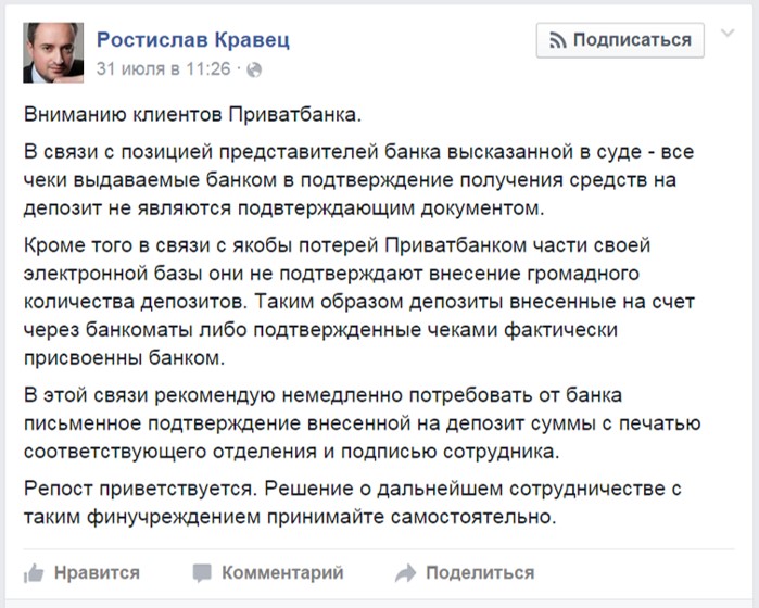 Но почему-то мне кажется, что управляющий партнер одной из крупнейших в Украине юридических контор (Адвокатская компания Кравец и Партнеры | Адвокатская компания. Адвокаты. Юридические консультации. Представительство в суде. Юридическое комплексное обслуживание. Внесудебное урегулирование споров. Медиация. Due diligence) от своего имени не стал бы делать "тупо очередной вброс"... "тупо очередные вбросы" делаются, например, ботами или джинсой через конвенционные СМИ... Кравец пообещал опубликовать касацию на днях... подождем... Я же это публикую тут не для очернения привата (я не их клиент и никогда им не был)... осведомлен = вооружен... и дай Бог чтобы никому из читающих это не довелось судиться с банками, в т.ч. и с приватом... |