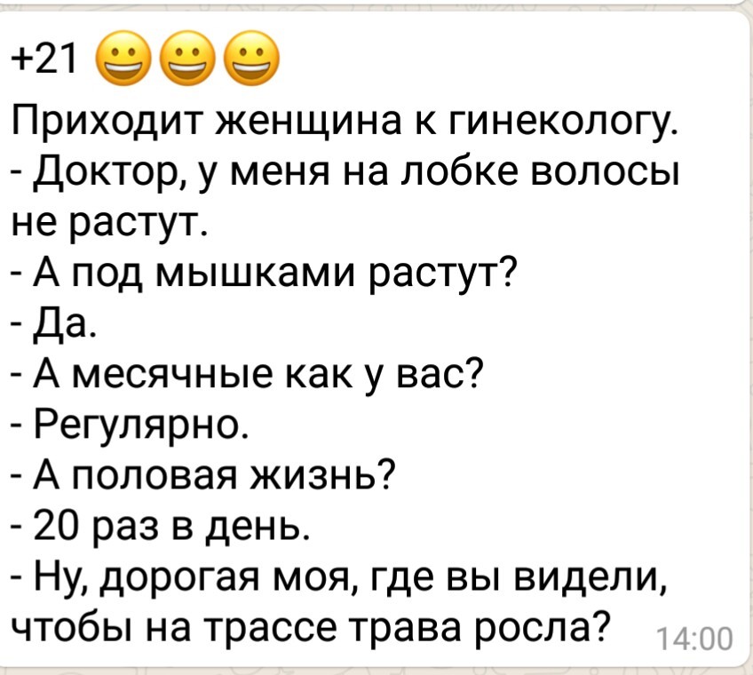 Выходит на подиум французская курочка, вся беленькая, в розовых бантиках. Комиссия ей вопрос задает: - Сколько у тебя любовников? - (с чувством собственного достоинства) Пятнадцать. - Сколько яиц в месяц несешь? - Сто пятьдесят. - Молодец! Хорошие показатели. Выходит на подиум английская курочка, вся рыженькая, в зеленых бантиках. - Сколько у тебя любовников? - (с чувством собственного достоинства) двадцать. - Сколько яиц в месяц несешь? - Двести. - Молодец! Отличные показатели. Выходит на подиум русская курица, вся синяя, взлохмаченная, с обломанными когтями. - Сколько у тебя любовников? - (на выдохе) ПИСЯТ! - Сколько яиц в месяц несешь? - ПИЦОТ!! - Слушай, ну у тебя такие показатели, ты бы уж могла бы себя как - то в порядок привести... - А КОГДА?!! То еб...сь, то несусь! |