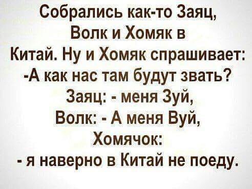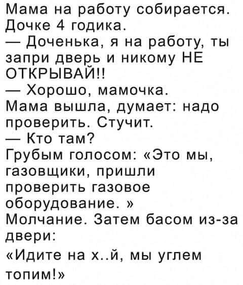 Один говорит, что можно узнать по плавникам. Другой отвечает, что это брехня, а вот по чешуе можно узнать. Третий доказывает, что нужно смотреть по жабрам… Тут к ним подплывает рыбнадзор, проверил их – всё нормально! А рыбаки у него и спрашивают: - Слушай, у нас тут спор вышел, вот подскажи, как знающий человек, как можно определить возраст рыбы? Инспектор говорит: - Ребята это секретный способ, вот если стакан нальёте – скажу! Да не вопрос! Вот тебе стакан, только скажи! Инспектор выпивает и поучительным тоном говорит: - Запомните, чем у рыбы дальше глаза от жопы , тем она старше!!! Добавлено через 3 минуты Муж уезжает в длительную командировку и прощается с женой: - Не могу оставить тебя на такой длительный период без секса, поэтому в секс-шопе купил тебе робота. Жена: - Да как ты мог подумать!…да я никогда ни с кем тебе не изменю! Даже с роботом! Муж: - Ну, как знаешь… Если вдруг передумаешь просто крикни «ЛЁЛИК, КО МНЕ!» и он всё сделает. Муж уезжает. Проходит две недели, жене на глаза всё время попадается ЛЁЛИК. Жена думает: - Жалко, конечно, денег потраченных на ЛЁЛИКА…может попробовать… чего даром стоит? Жена решается: - …ЛЁЛИК, КО МНЕ!!!! ЛЁЛИК включается. 8 часов безумного, беспрерывного секса, её покидают силы, но одна проблема…жена не знает как его выключить. Изнеможенная подползает к окну, выглядывает и видит во дворе дворника Михалыча, который подметает двор. Жена: -Михалыч! Есть дело на бутылку! Крикни «ЛЁЛИК, КО МНЕ!!!» Михалыч, не долго думая: - ЛЁЛИК, КО МНЕ!!!!… Прошло полтора месяца, муж возвращается из командировки, во дворе кучи мусора, в доме выбиты стёкла, людей на улице не видно. Из-за угла появляется Михалыч с винтовкой вместо метлы, небритый, с красными глазами,штаны на жопе рваные.... Муж: - Михалыч, а что произошло? Где ВСЕ????… Михалыч: - Тихо, БЛ*ДЬ!!!!!!!!… Я не знаю, ГДЕ ВСЕ!!!!… НО… ЛЁЛИК ГДЕ-ТО РЯДОМ!!!