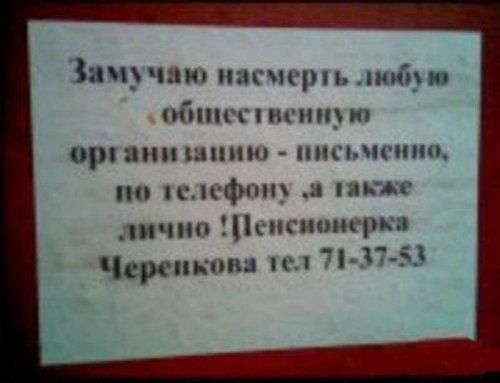 печи, на руках у нее свадебное платье невесты, порваное накануне, в руках - иголка с ниткой. Тут из спальни молодоженов выходит жених с большого будунища и нетрезвой походкой направляется к ведру с водой. Теща к нему: - Зятек, помоги нитку в иголку вставить, вишь, старая стала, никак не могу попасть... Зять, дрожащими руками стуча кружкой об ведро: - Мама, а не пошли бы вы на х.., я тут кружкой в ведро попасть не могу!!!