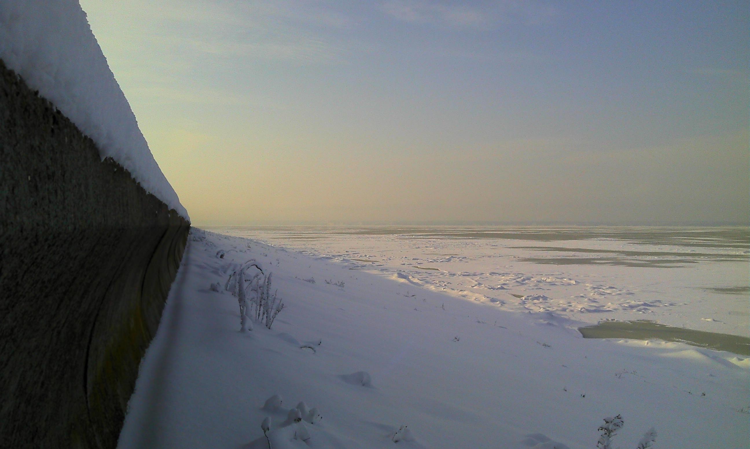 Сегодня ехал обратно, не поленился, долез до бордюра в том месте, а снегу то намело! Набрал полные ботинки, сейчас сижу на работе с мокрыми ногами. Вот вам бордюр с обратной стороны - высота 160см (померял рулеткой), отрицательный угол, как видите, а снизу не широкая полоса заснеженного обледеневшего бетона под приличным уклоном, не позволяющая использовать разгон, замёрзшее море и всё.. И такая конструкция берега тянется на 20 км без единого разрыва. Ну и кто, скажите на милость, из предложенных кандидатур мог сюда спрыгнуть-запрыгнуть да и что ему делать в таком неприветливом месте?