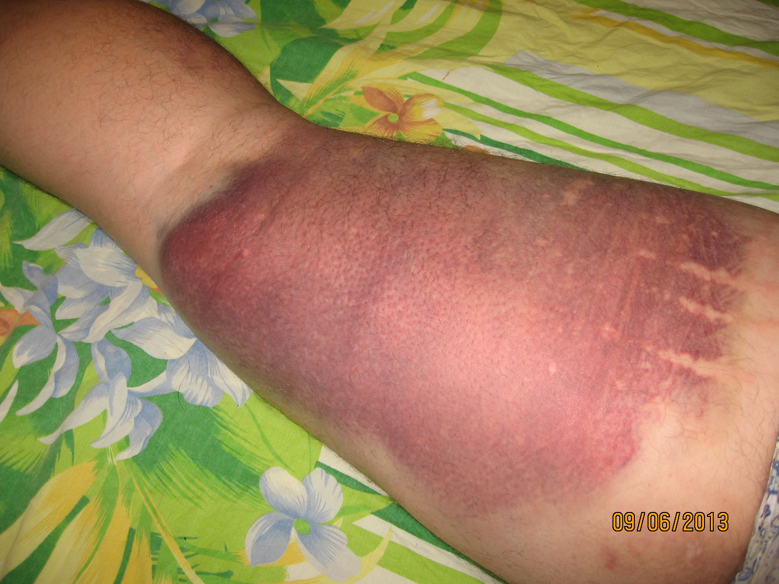 Это похоже что не из за удара, а сильно потянутая или скорей подорвана мышца.