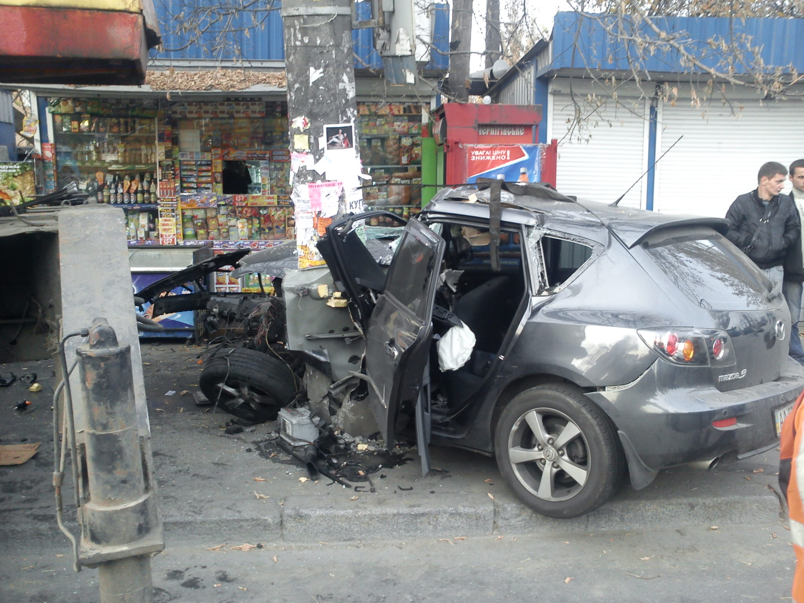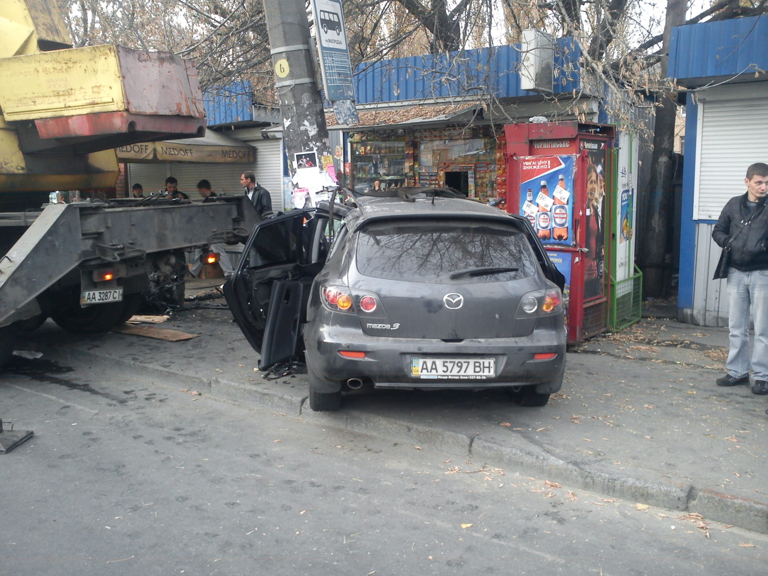 Сегодня, идя домой со стоянки, увидел такую картину. Перекрёсток Вышгородской и пр.Правды! Сколько знаю эту дорогу, если ехать с Оболони на Веник, то после пересечения Вышгородской (возле заезда на Макдрайв), на дороге имеется трамплин! Если летишь с хорошей скоростью, то машину подбрасывает прилично! Не уверен, но очень похоже, что Мазду кинуло именно на этом трамплине!
