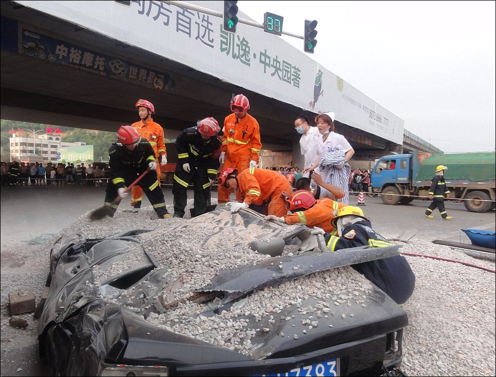 Прибывшие спасатели с удивлением обнаружили, что водитель легковушки жив! Они живо бросились раскапывать завал, затем при помощи подъемного крана поставили грузовик на колеса. Срезав крышу раздавленого автомобиля, спасатели, наконец, смогли достать водителя. С момента аварии прошел всего 1 час. Пострадавшего доставили в больницу, где врачи констатировали у него несколько переломов. Учитывая ужасающее состояние автомобиля, можно сказать, что он легко отделался. |