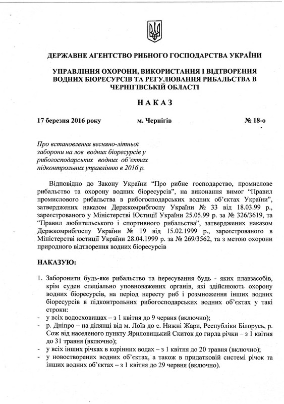 Правила лову риби під час нересту передбачають: вилов лише з берега, лише в межах населеного пункту, лише дозволеними знаряддями лову - 1 вудкою/донкою з одним гачком або спінінгом, з дотримання норм вилову - до 3 кг/день на людину, лише в дозволених місцях; рибалка в природних нерестовищах і на території зимувальних ям категорично заборонена. В період нересту заборонено проводити днопоглиблювальні, вибухові та інші види робіт, добувати будівельні матеріали (видобування піщано-гравійної суміші, розчистка русел річок, днопоглиблення, берегоукріплення тощо), проводити змагання із спортивного рибальства, проводити підводне полювання, пересування плавучих засобів (човнів). Відповідно до Правил любительського та спортивного рибальства в цей час дозвіл на використання плавальних засобів мають тільки органи, що займаються охороною водоймищ. За порушення правил рибальства під час нересту передбачено покарання від адміністративних штрафів до кримінальної відповідальності. Відповідно до Кодексу України про адміністративні правопорушення, за порушення правил рибальства, в тому числі і за пересування плавзасобів в період нересту по воді, передбачено попередження або накладення штрафу на громадян від 34 до 170 грн, на посадових осіб від 170 до 510 грн; за грубе порушення правил рибальства (наприклад, за рибальство із застосуванням вогнепальної зброї, електроструму, вибухових або отруйних речовин, інших заборонених знарядь лову, промислових знарядь лову особами, які не мають дозволу на промисел тощо) передбачено штраф 340-680 грн з конфіскацією знарядь і засобів вчинення правопорушення, на посадових осіб 510-850 грн з конфіскацією знарядь і засобів вчинення правопорушення. Залежно від ступеня завданих збитків, за грубі порушення передбачена також кримінальна відповідальність - штраф 3400 – 6800 грн або позбавлення волі строком до 3 років з конфіскацією знарядь і засобів лову, та незаконно добутих водних біоресурсів. Крім штрафу за незаконний вилов правопорушник змушений буде відшкодувати збитки за кожну виловлену рибину, незалежно від її розміру та ваги. В кожної рибини є своя ціна. Так, відповідно до постанови Кабінету Міністрів України №1209 від 21.11.2011, встановлено такси для обчислення розміру відшкодування шкоди за кожний екземпляр незаконно впійманої рибини в грн: судак – 510, сом – 425, щука – 340, короп – 306, білий амур, товстолоб, білизна – 255, плітка, синець, клепець – 85, карась сріблястий, окунь і верховодка – 17, лящ – 170, лин – 119 грн., краснопірка – 68 грн., підуст, плоскирка – 34 грн. Незаконний вилов видів водних біоресурсів, які занесені до Червоної книги України, тягне за собою накладення штрафу на громадян від 340 до 510 грн з конфіскацією незаконно добутого і на посадових осіб - від 510 до 850 грн. з конфіскацією незаконно добутого. За один екземпляр незаконно добутих, знищених або пошкоджених водних біоресурсів з числа видів, занесених до Червоної книги України, поширених на території Чернігівської області, згідно постанови Кабінету Міністрів України від 07.11.2012 № 1030, передбачені компенсація: за йоржа носаря - 165 грн, карася золотого - 330 грн., міноги української - 74 грн., стерляді - 48 000 грн., марени дніпровської - 820 грн., миня річкового – 330 грн. Добавлено через 1 минуту Чернігіврибоохорона відповідає на численні запитання громадян щодо заборони перебу