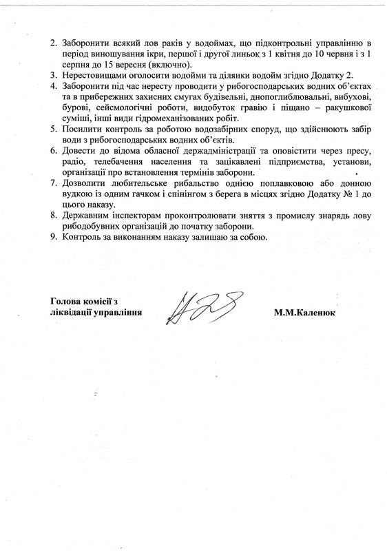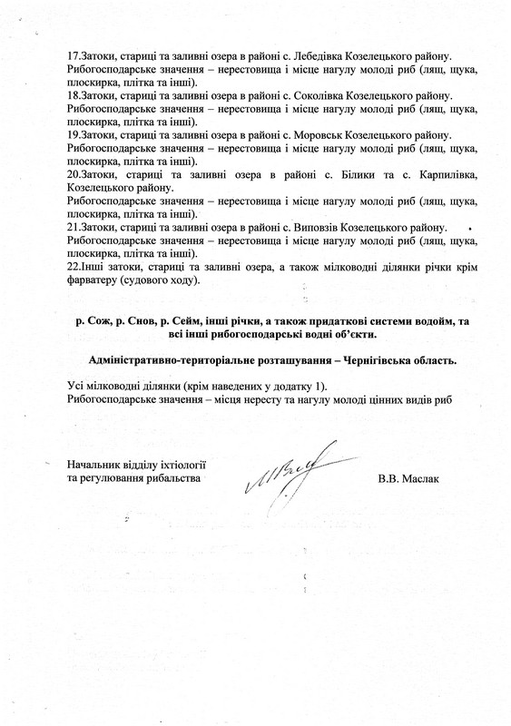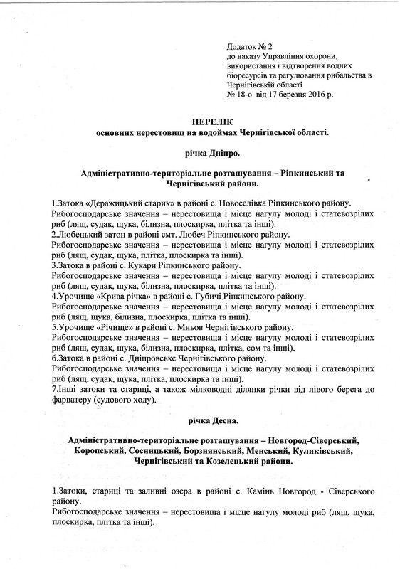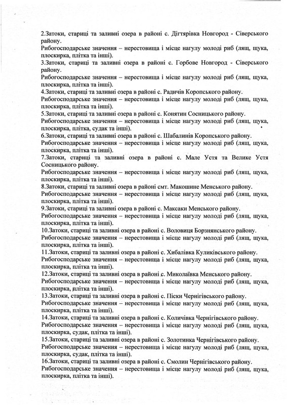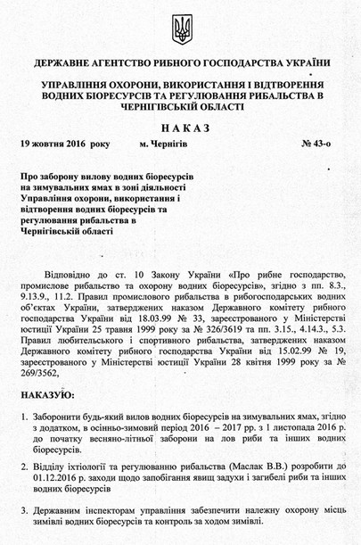 С целью недопущения вылова водных биоресурсов в местах их массового скопления (зимовки) приказом, Черниговрыбохраны с 1 ноября и до начала весенне-летнего запрета на лов рыбы, запрещается вылов любых водных биоресурсов на зимовальных ямах. Запрет касается следующих водоемов: р. Сож • от устья р. Немыльня Репкинского района вниз 1 км, площадь 7,5 га; • от устья р. Сож Репкинского района против течения 1 км. р. Днепр • от устья р. Сож Репкинского района вниз 1 км; • от с. Лопатни Репкинского района вверх против течения 3 км; • от входа в Любедский затон пгт. Любеч Репкинского района вверх против течения 4 км включая урочище Змеи; • от выхода из Станецкого старика Репкинского района вниз 1 км и вверх 1 км; • от выхода из Редьковского старика Репкинского района вверх против течения 1,5 км; • от входа в урочища Речище Черниговского района ко входу в урочище Яблунив Черниговского района по течению; • от выхода из урочище Яблунив Черниговского района вверх и вниз по 500 м. в обе стороны; • От автомобильного моста через р. Днепр Черниговского района вниз 4 км до выхода из урочища Пресовальня. р. Десна • от устья р. Смячка Новгород-Сиверского района вверх 500 м, вниз 1 км - площадь 7,5 га; • р. Смячка Новгород-Сиверского района к прудам рыбного хозяйства - площадь 10,5 га; • Каменская затока в районе с. Камень Новгород-Сиверского района, площадь 25 га; • затока Речица на р. Судость возле с. Колос Новгород-Сиверского района; • от бакенского дома в с. Муравьи Новгород-Сиверского района, вверх против течения 200 метров; • от устья р. Судость до устья р. Пятна возле с. Камень Новгород-Сиверского района; • от устья р. Убидь Сосницкого района вверх и вниз 1 км; • р. Убидь Сосницкого района со всеми рукавами от устья до моста в Соснице; • от устья р. Снов Черниговского района вверх 2,5 км и вниз 1 км; • от устья р. Замглай вниз по течению 9 км до озера Полковница; • затока Западного порта Чернигова, площадь 10,5 га; • от железнодорожного моста около Чернигова в автодорожного моста в с. Шестовица Черниговского района, площадь 190 га; • р. Белоус от устья до сбросного сооружения ОАО Черниговрыбхоз в районе с. Жавинка, площадь 2,25 га; • от начала базы отдыха «Чезара» с. Ладинка Черниговского района вверх против течения 500 м, площадь 5 га; • от входа в Слабинский старик в районе с. Ладинка Черниговского района вниз по течению - 300 м, площадь 6 га; • участок р. Десна вниз и вверх 500 м от входа в Выповзовский старик и Выповзовский старик в районе с. Выповзов Козелецкого района, площадь 22 га; • от выхода из пролива Озеро в районе с. Евминка Козелецкого района (насосная станция) до входа в р. Слепец в районе с. Крехаев Козелецкого района протяженностью 2 км.