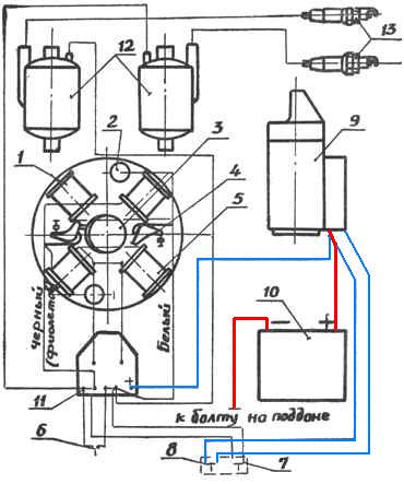 "-" цепляется на корпус двигателя, а "+" на шпильку стартера.
