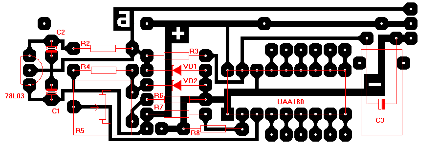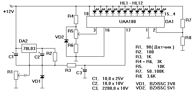 Цепочка R3, C3 замедляет изменение напряжения на измерительном входе 17 микросхемы UAA180. Постоянная времени цепочки около 2 секунд. Такое замедление должно предотвращать скачки в показаниях прибора при колебаниях поплавка датчика вместе с уровнем бензина во время движения.