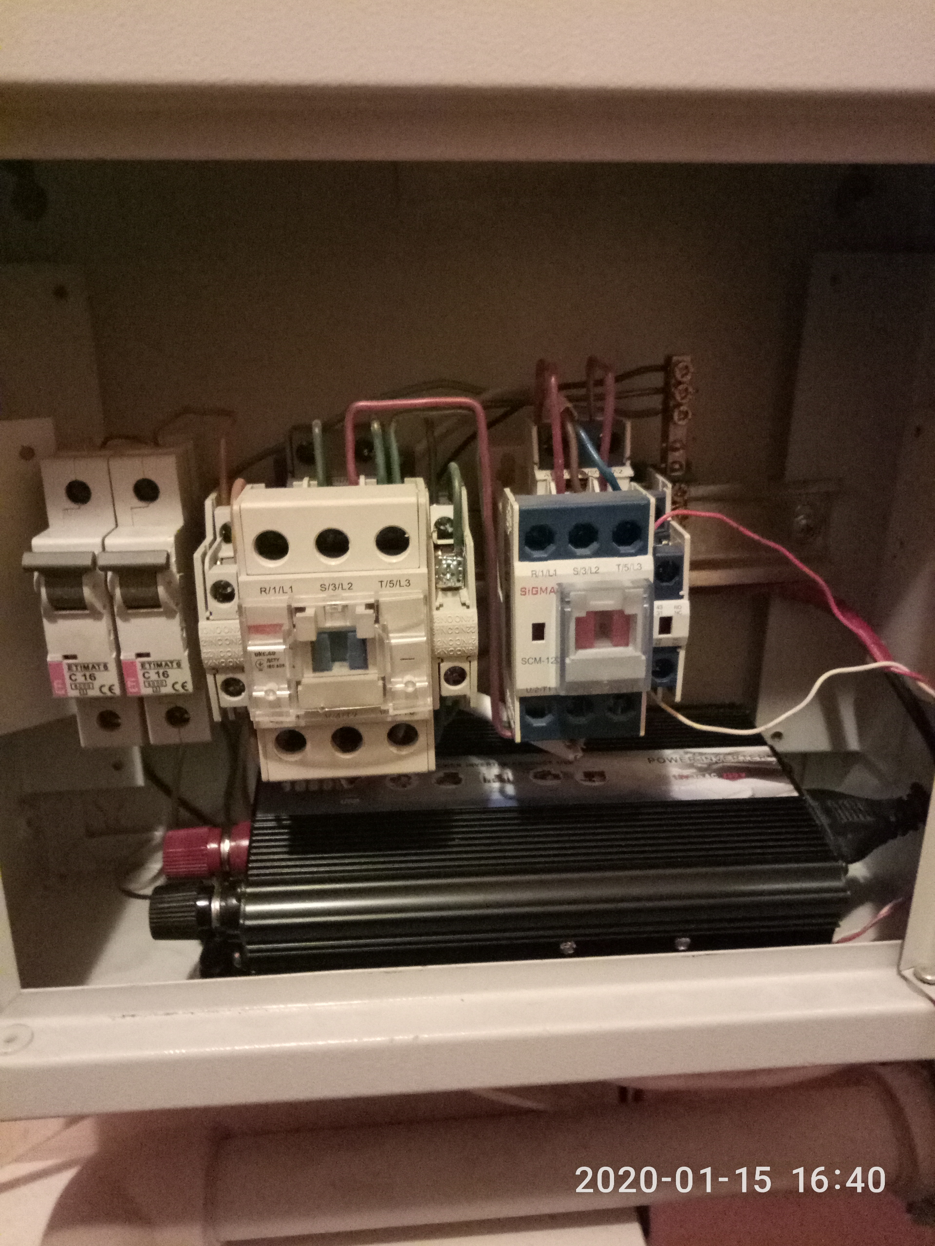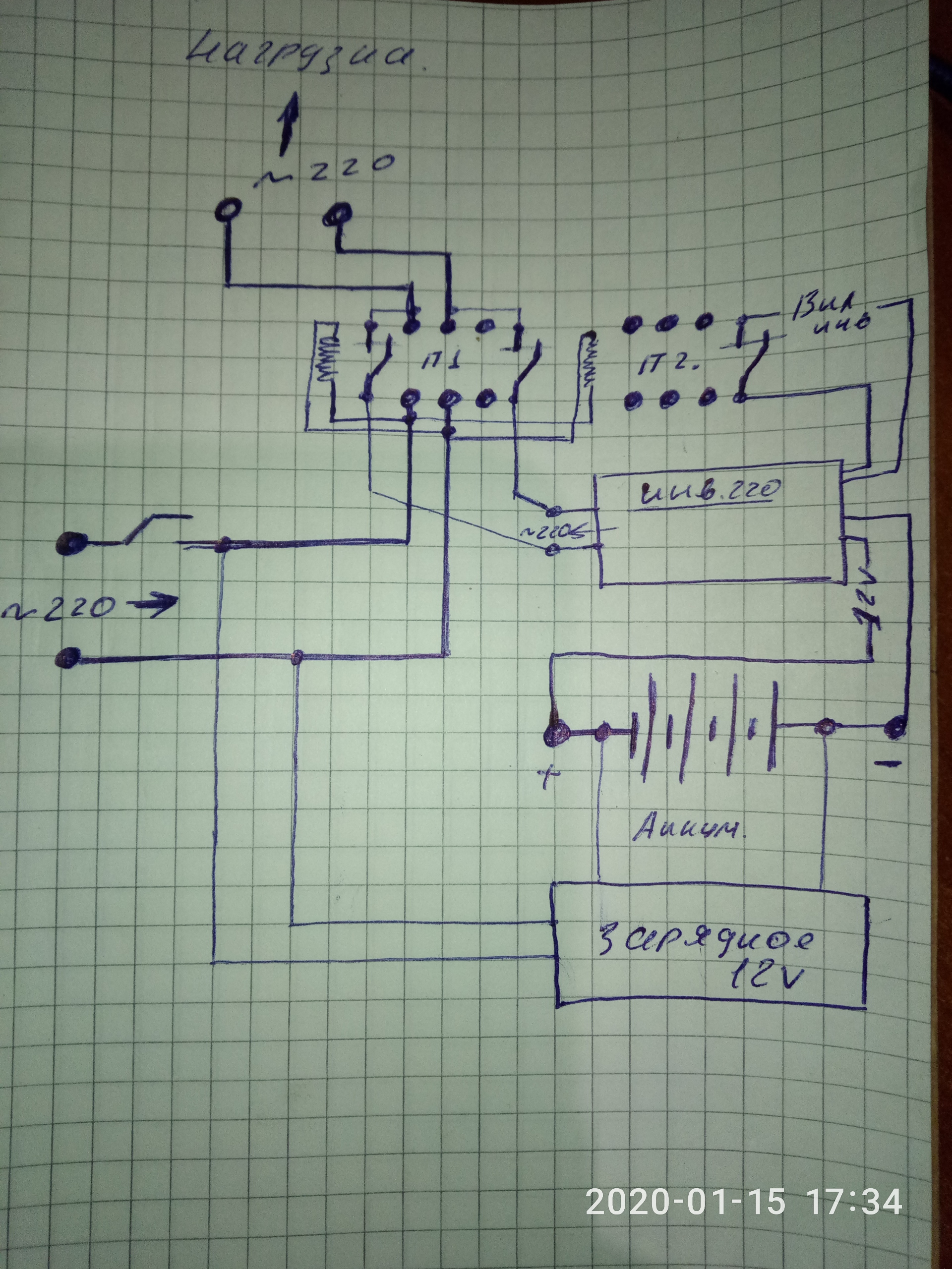 ну принцип таков,при отключении питания,пускатели отстреливаются и замыкают"обратные" контакторы по бокам у себя.это и есть сигнал на включение инвертора, пускатель 2, и соответственно пускатель 1 контакты на подачу 220 от инвертора. и при появлении сети,пускатели включаясь,дают напрямую сеть и отключают "обратные" тем самым отключают инвертор,ну и дают дробро на зарядку аккума.на скорую руку на листике это выглядет так...