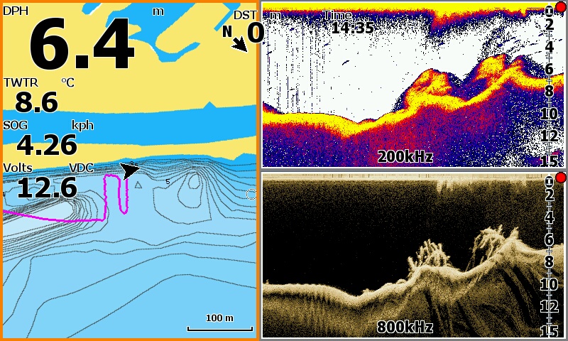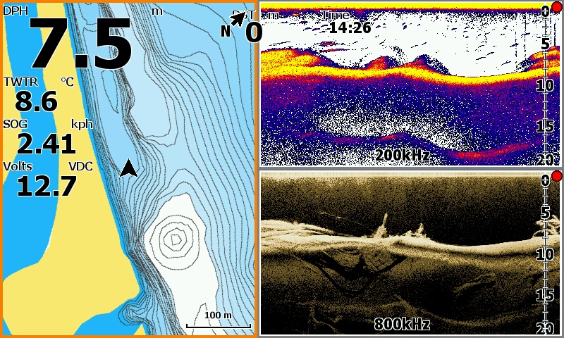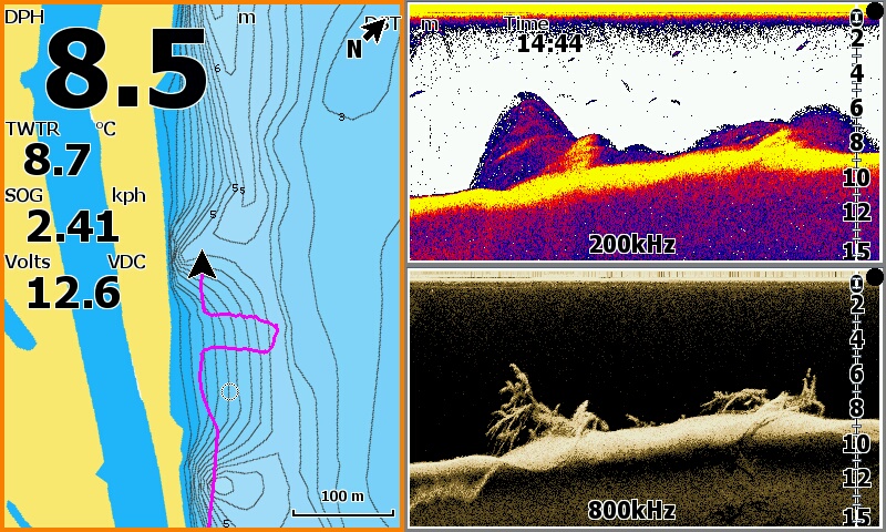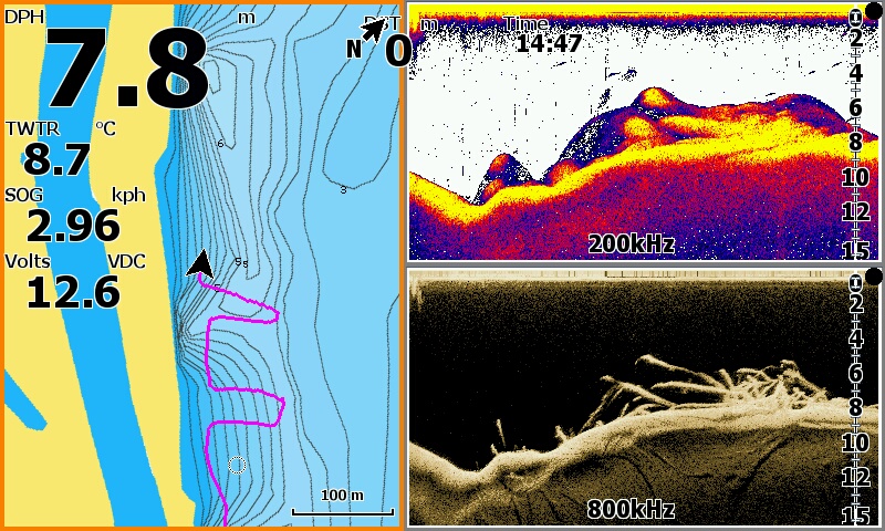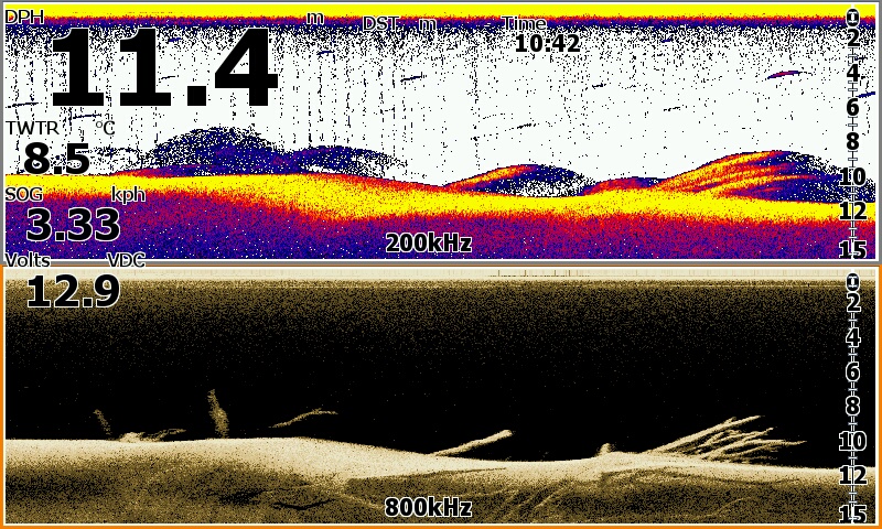 А если поиграться с настройками и включить наложение нижнего сканирования хоть 455 хоть 800 (455 мне больше нравится), и подобрать цвет и градацию оттенков то и красивее можно видеть ![]() Чтобы на луче 200 плоть рыбы, траву, и муляку на свалах и на дне и эхо от объектов рисовало цветными оттенками а наложенный на цветное черный цвет от луча 455 или 800 показывал все твердое....скилеты, пузыри, коряги, и твердые участки дна. У меня хоть и пятерка на яйки в нутри теже ![]() Скрины с осени со стаями бели и охотниками, и всякое разное с квочением и подходами сома. Поиграйтесь настройками