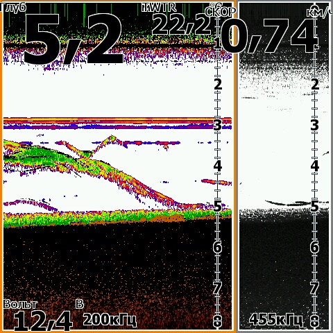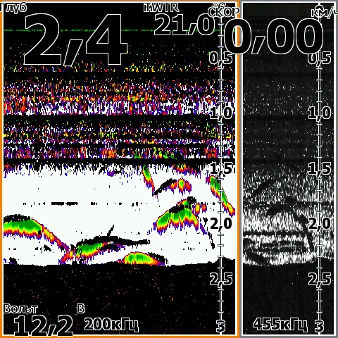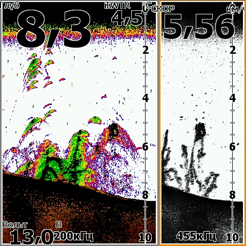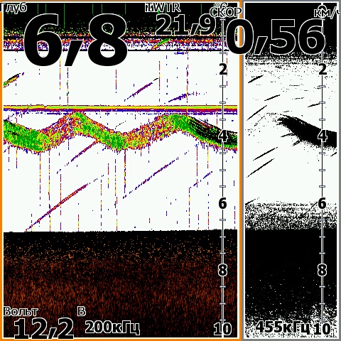 А если поиграться с настройками и включить наложение нижнего сканирования хоть 455 хоть 800 (455 мне больше нравится), и подобрать цвет и градацию оттенков то и красивее можно видеть ![]() Чтобы на луче 200 плоть рыбы, траву, и муляку на свалах и на дне и эхо от объектов рисовало цветными оттенками а наложенный на цветное черный цвет от луча 455 или 800 показывал все твердое....скилеты, пузыри, коряги, и твердые участки дна. У меня хоть и пятерка на яйки в нутри теже ![]() Скрины с осени со стаями бели и охотниками, и всякое разное с квочением и подходами сома. Поиграйтесь настройками