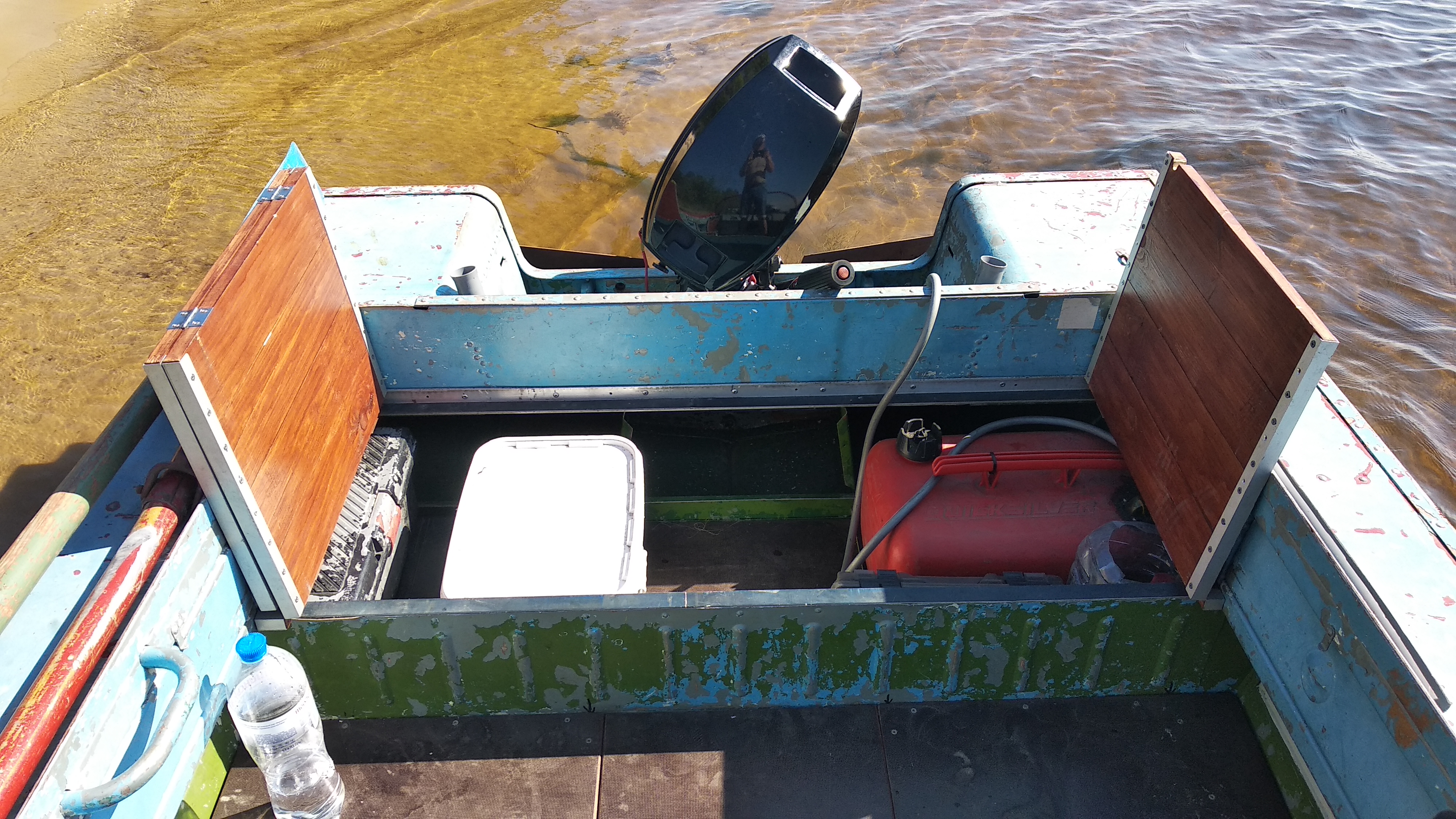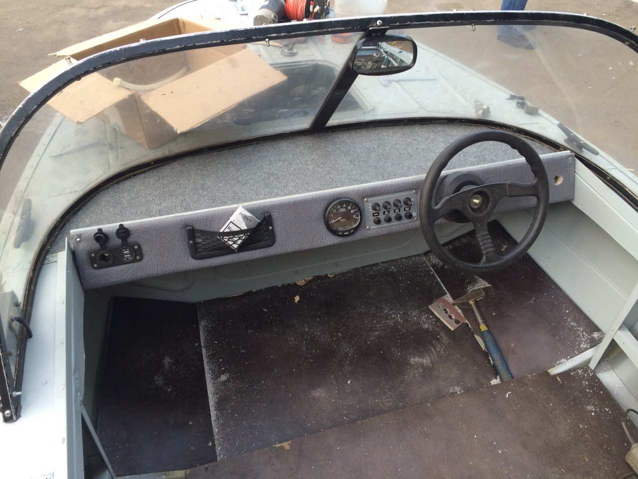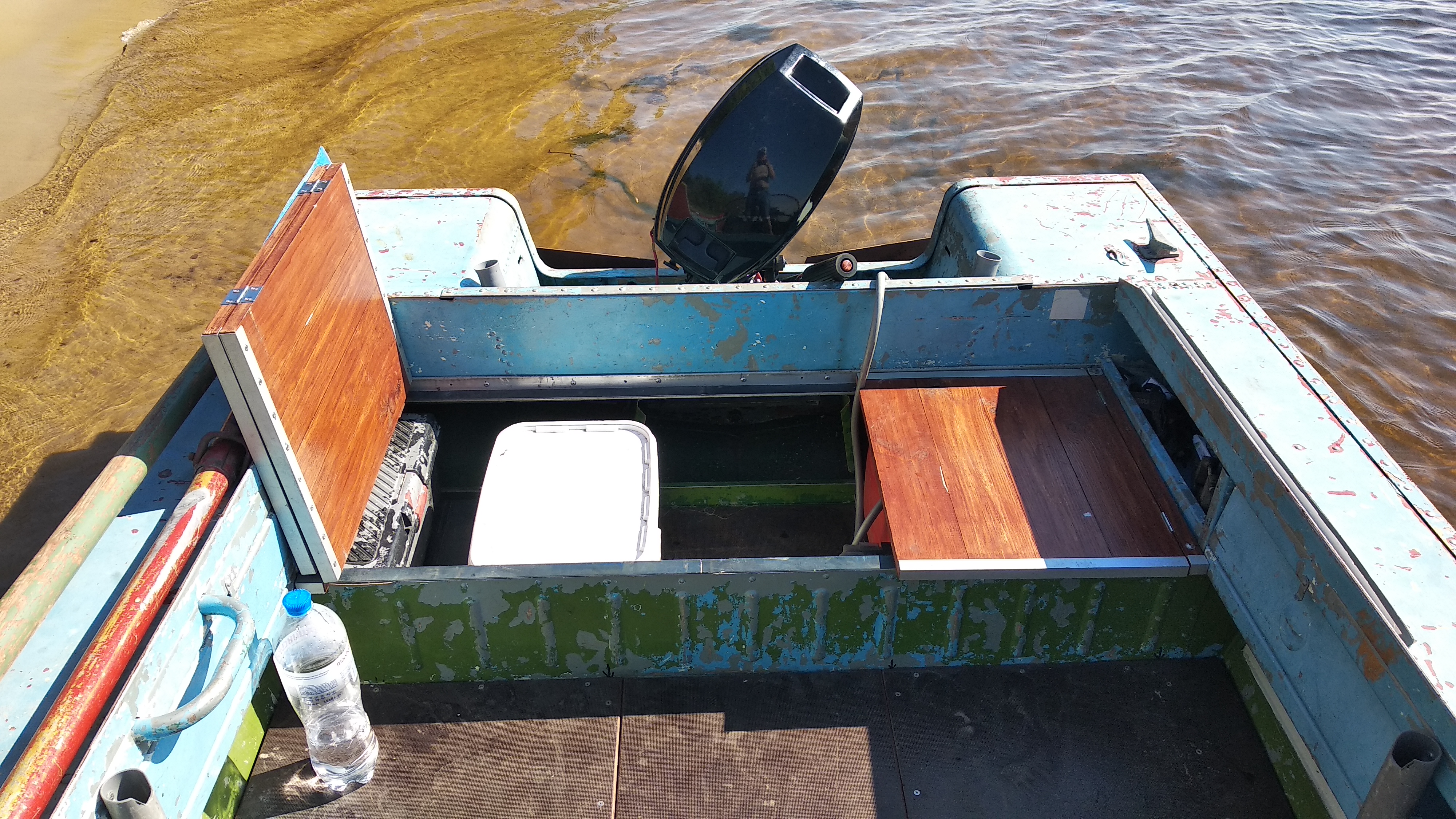 В заднем рундуке тоже пол зашил. Уровень пола рундука ниже чем в кокпите. В рундук удобно и четко по высоте уместился бак,при транспортировке на лафете я скамью над баком фиксирую слесарной струбциной и у него больше нет шансов подпрыгнуть перевернуться и залить бензином днище(уже проходили). Вообще задний рундук теперь используется абсолютно по разному в зависимости от потребностей. Бак сьедает 1/3 места,остальные 2/3 это либо багажник,либо моя танцплощадка со спиннингом во время рыбалки. Когда в лодке трое такое своеобразное удлиннение кокпита на пол метра дорогого стоит. Управляю румпелем сидя в пол оборота(специально скамью так выдумывал),к тому же изза того что пол в рундуке пониже колени не затекают,сижу по человечески хоть и без спинки. Еще я сделал калитку в штатном стекле и врезал прогрессовский люк,установил усилители чтобы в носу тоже сделать кусочек палубы под люком. На крайней рыбалке парнями подмечено что в люке королевское место спининговать. При расположении троих рыбацюг один в рундуке,один в кокпите,один в люке люди максимально растянуты по лодке,при таком раскладе рыбалку с этой лодки втроем уже можно назвать комфортной