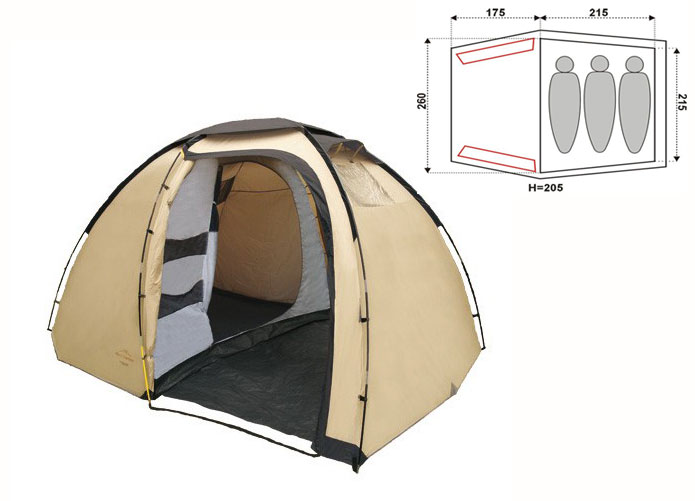 3-х местная двухслойная комфортная палатка. Каркас - 3 дуги. Герметичные швы, вентиляция, дышащий материал спальни, противомоскитная сетка, возможна установка тента без спальни. 1 вход, большая прихожая. Преимущества: высокий потолок, простая и быстрая установка, установка палатки во время дождя.