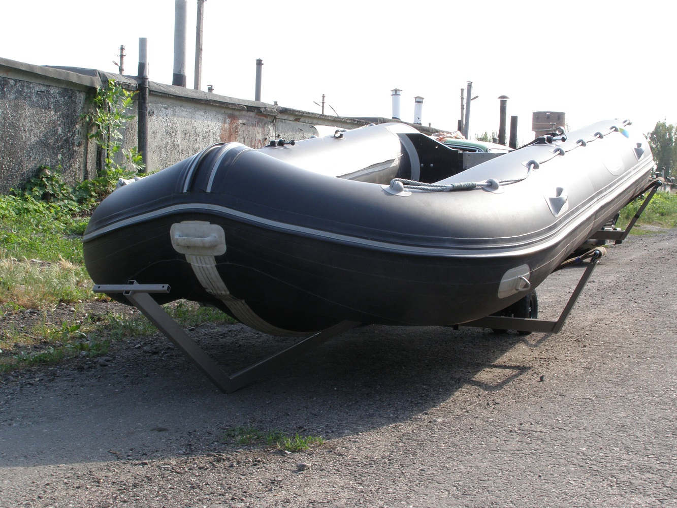Уже говорил, что крейсер у меня "Кэптен-Комбат-410". Лодка хороша всем, но тяжеловата. И при использовании транцевых колес тяжело не столько её катить, сколько просто держать на весу за носовую ручку всю массу лодки. Как выход в прошлом году задумал некое подобие автомобильного лафета - только "ручную версию". Получилось так: