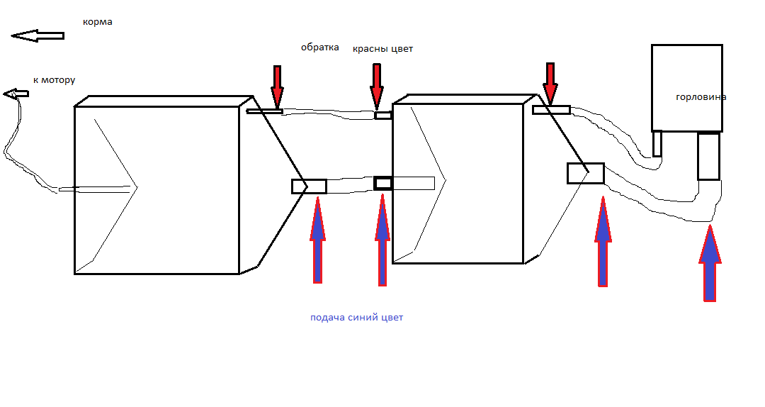Обратка с кормового бака переходит в передний бак, а от туда к горловине. Все обратки стоят в верхней часи баков.