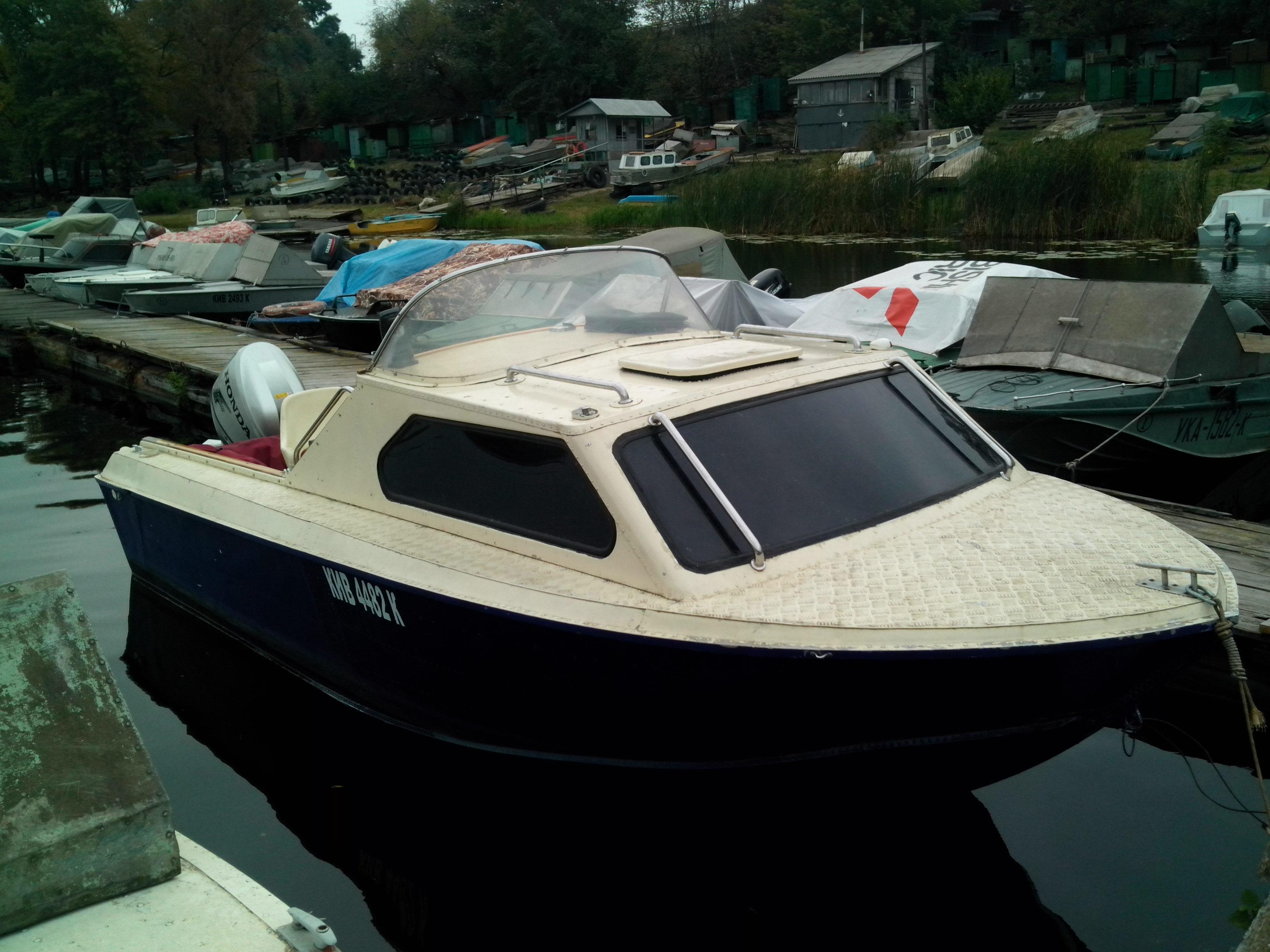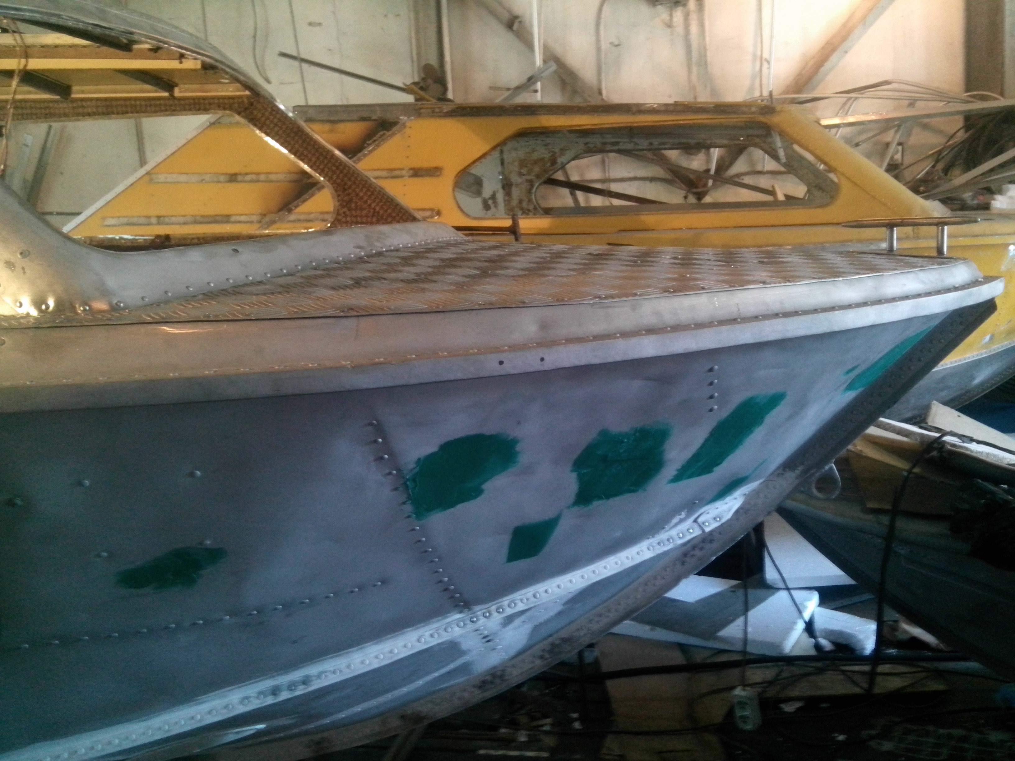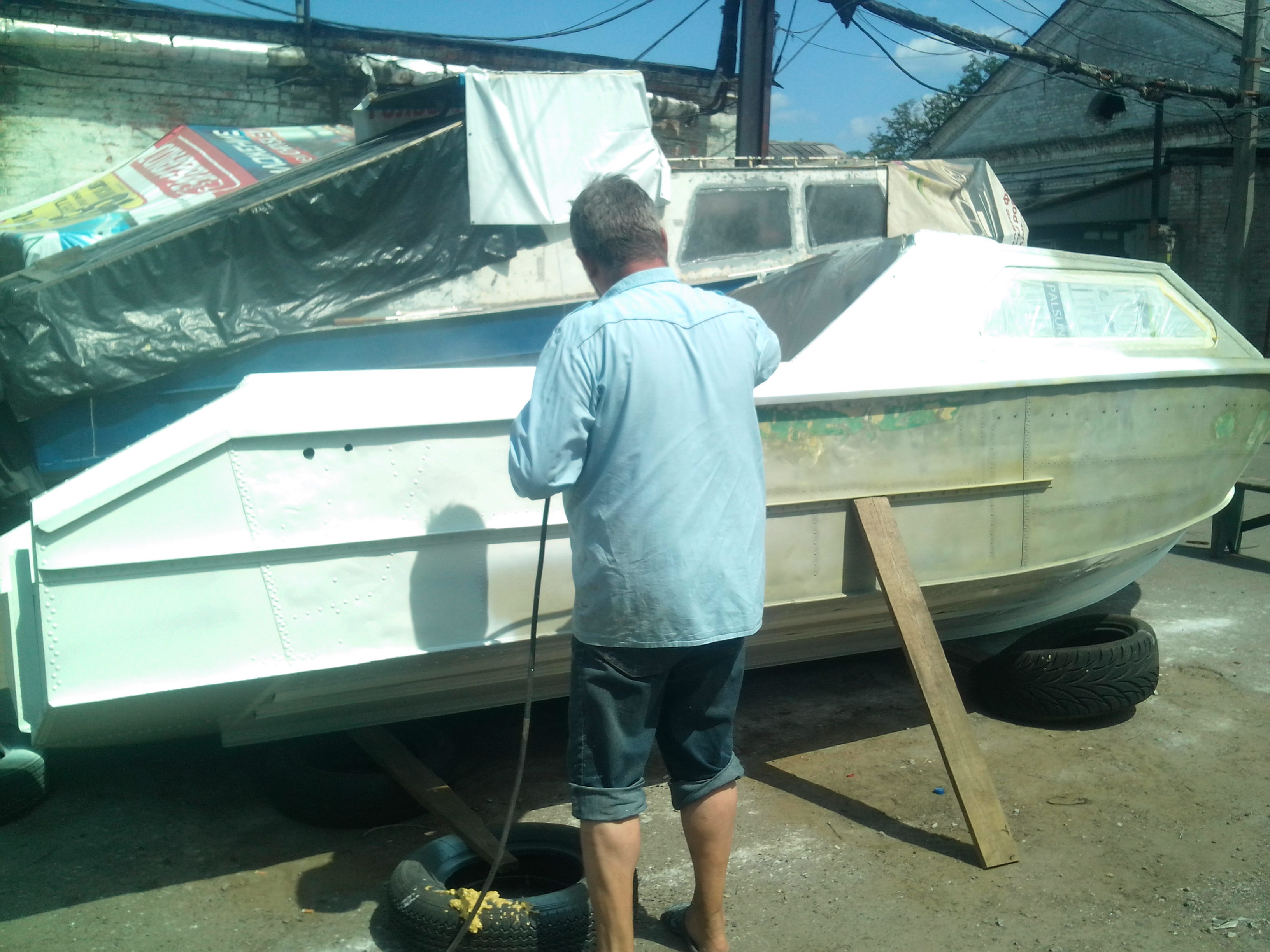 Добрый вечер! Высылаю первый подвернувшийся вариант полноценной переделки лодки "Москва-2",то есть решение основных проблем этих корпусов, хотя эта лодка уже была у меня в работе, но предыдущий владелец, к сожалению, заказал, только, усиление каютной переборки, выносной кронштейн под ПЛМ, новые дуги и дорогой тент, красного (?) цвета, а нынешний хозяин, обладая высокой степенью педантичности, аккуратности и уважением деньгам, заработанным собственным трудом, категорически не захотел мириться с неполным комплексом необходимых работ и, после разборки, усиления, сборки, пескоструя и покраски, только дуги, тент, а так же, усиленный шпангоут каютной переборки, установленный нами ранее, не претерпел изменений, так что решайте сами: покупать голый корпус, с парой стареньких советских "подвесняков", или платить, за кучу блестящих игрушек, (купленных от безделия долгими зимними вечерами в интернет-магазинах) навешенных на лодку, как на ёлку и красиво выкрашенный корпус, обклеенный, пока ещё симпатичным, но уже потихоньку, подванивающим ковролином.