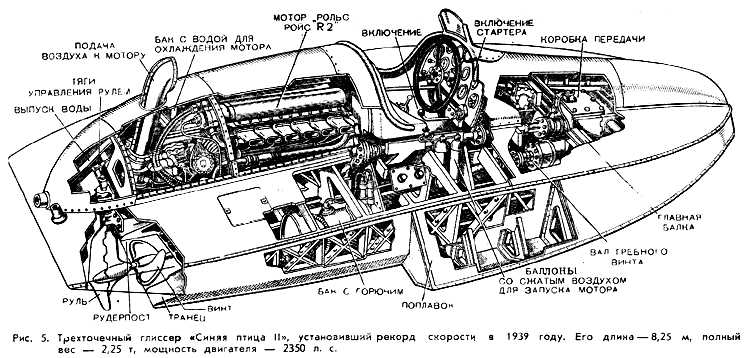 Первым рекордным трехточечным глиссером класса «без ограничений» стал английский глиссер «Синяя птица II», построенный в 1939 году (рис. 5). Трехточечный корпус был предложен впервые еще в 1916 году, но в те годы скорости глиссеров были еще небольшими и эта идея не получила развития. Трехточечную схему применили лишь в 1936 году.