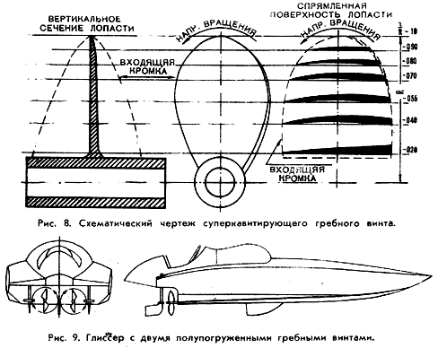 Незадолго до второй мировой войны советский ученый, академик В. Л. Поздюнин, открыл явление «суперкавитации». Теперь на очень быстроходных глиссирующих судах с успехом стали применять суперкавитирующие гребные винты. Преимущество этих винтов заключается в том, что благодаря очень быстрому вращению и особому профилю лопастей (рис. 8) удается обезвредить кавитацию (кавитацией называют закипание воды и образование паровых и газовых пузырей на очень быстро движущихся лопастях гребных винтов и на подводных крыльях). Наконец, на быстроходных глиссерах иногда применяют и «полупогруженные» гребные винты, опущенные в воду лишь на 40% их диаметра. Такие винты выгодны тем, что позволяют располагать гребной вал в корпусе судна. Это делает ненужными кронштейны гребного вала и позволяет установить ось винта почти горизонтально (рис. 9).