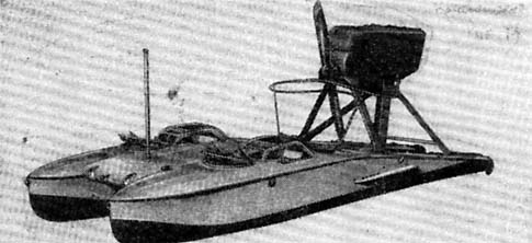 Одним из лучших глиссеров Автодора был морской глиссирующий катамаран с воздушным винтом — «Автодор-13» (рис. 14). С мотором мощностью 350 л. с., при полном водоизмещении 2,83 т он ходил со скоростью 83 км/час, а при перегрузке до 3,25 т — со скоростью 72 км/час.