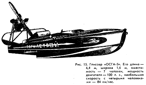 Из глиссеров, построенных в те годы нашей промышленностью, следует отметить транспортные речные глиссеры «ОСГА». Из них глиссер «ОСГА-5» был самым быстроходным (рис. 15). С отечественным мотором «М-11» мощностью 100 л. с. при четырех пассажирах он развивал скорость до 84 км/час. Наибольший по своим размерам «ОСГА-9» (рис. 16) вмещал 20 человек, и с мотором «М-17» мощностью 450 л. с. ходил со скоростью до 70 км/час. Все эти глиссеры строились из дерева и фанеры, их внутреннее оборудование и отделка помещений были очень скромными.