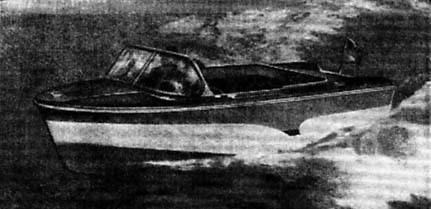Рис. 20 Четырехместный безреданный глиссирующий катер из пластмассы с поворотной Z-образной забортной силовой передачей, Его длина — 4,85 м, ширина — 1,8 м, высота борта — 0,813 м, водоизмещение — 1 т, мощность двигателя — 33 л. с., скорость наибольшая — 35 км/час.