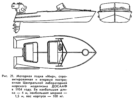 Из большого числа прогулочных и скоростных спортивных глиссеров, построенных за последние годы коллективами ДОСААФ, следует отметить популярную моторную лодку «Мир» (рис. 21), спроектированную и впервые построенную Центральной лабораторией морского моделизма ДОСААФ в 1954 году. Эта лодка предназначена для водных прогулок, спортивного рыболовства и охоты, для ближнего туризма. Она вмещает четыре человека и с мотором «ЛМР-6» (6 л. с.) развивает скорость 18 км/час. В 1960 году Центральный морской клуб ДОСААФ спроектировал и построил спортивно-туристскую моторную лодку «Рубин» (рис. 22). Вместимость этой лодки — 4 человека. С мотором «Москва» (10 л. с.) она развивает скорость 20—24 км/час с четырьмя пассажирами и 30—34 км/час — с одним человеком. Корпус обеих лодок построен из дерева и фанеры.