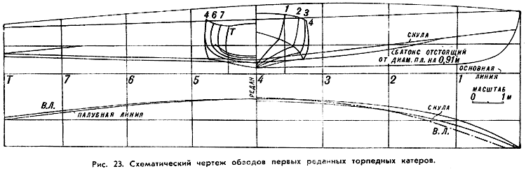 Катера Торникрофта имели большой успех, и в послевоенные годы различные типы торпедных катеров-глиссеров были приняты на вооружение флотами многих стран. Водоизмещение, скорость, размеры, вооружение катеров и мощность их двигателей росли с каждым годом. К началу второй мировой войны в Англии уже существовали торпедные катера-глиссеры водоизмещением до 37 т, с машинной установкой мощностью более 3000 л. с. Эти катера были вооружены двумя трубными аппаратами и ходили со скоростью более 10 узлов (рис. 11). Подобные торпедные катера строились в Италии, Германии, Франции и других государствах. Их строили не только из дерева, но и из легких сплавов и стали. Все они были оборудованы радиостанциями, часто имели вспомогательные двигатели для очень малого бесшумного хода.