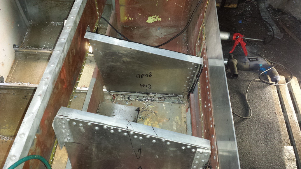 И так, реданы установлены, днище усилено допстрингерами, заклепки по днищу заменены на 5мм по шпангоутам. Дальше работа была по усилению и поднятию транца. На транец наклепал цельный лист АМГ-3 толщиной 3мм. Усилители сделаны с этого же материала. Самоотливной рецес поднят. Все клепалось заклепками АМГ 5мм. Дальше по планам усилить нос и сделать переднюю палубу, затем подниму борта на 18-20 см.