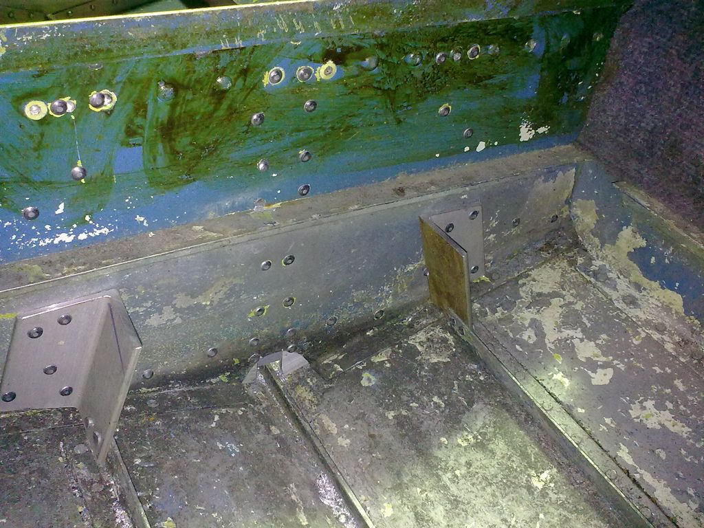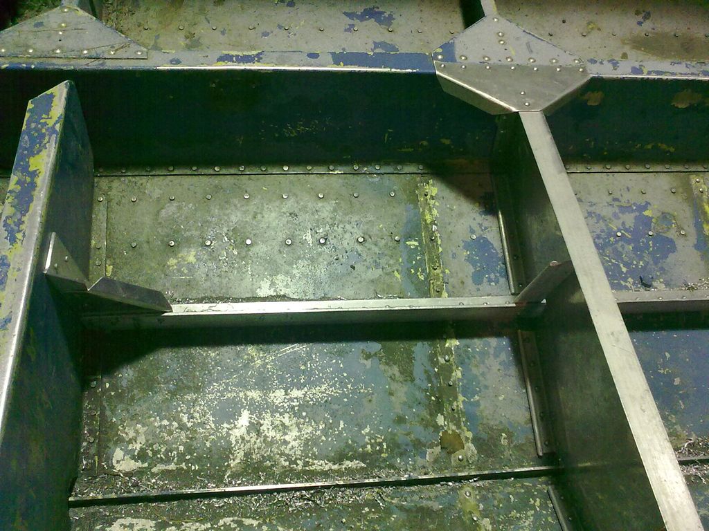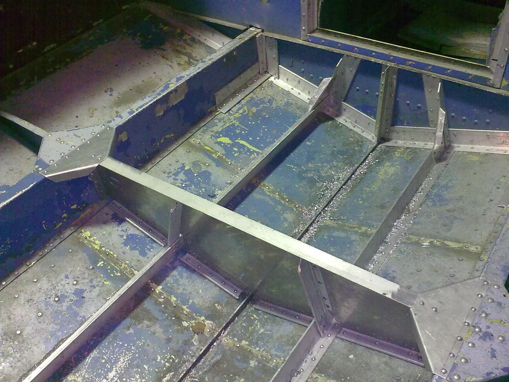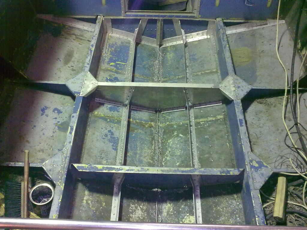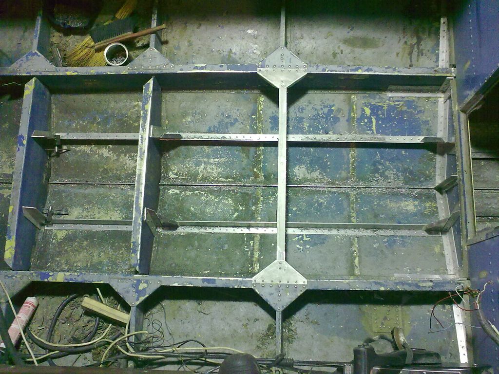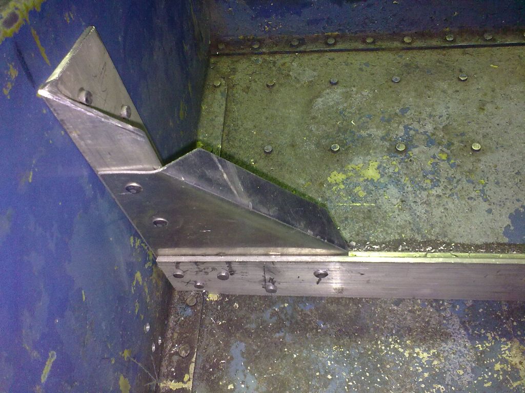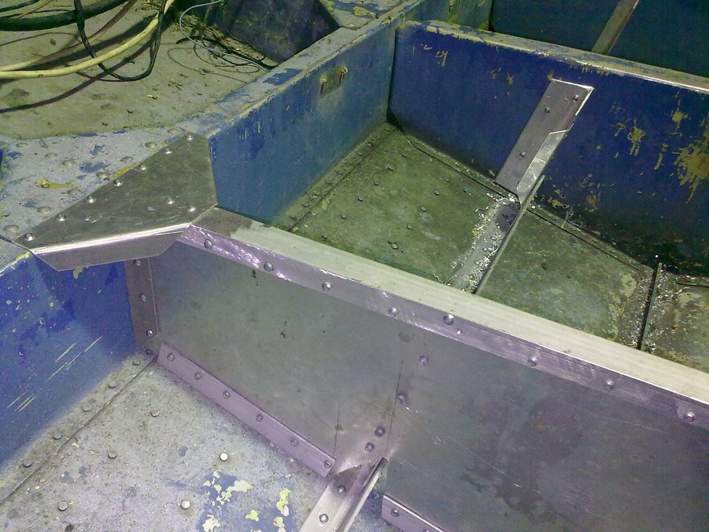 Продолжая усиливать набор Антохиной лодки, разделили расстояние, на отрихтованном с матюками, днище, между килем и родным стрингером на две части и вклепали, в этом месте, новый стрингер, сшив его со шпангоутами косынками и мощными уголками, скреплёнными, с обеих сторон, на всю высоту поперечного набора, после чего, через переборку каюты, к новым стрингерам, уголками, привязали родные, расположенные между килем и рундуком, стрингера (которые, по большому счёту, нужно вырубить, и заменить – более мощными, но такая задача не ставилась), а в центральной части кокпита, удалив Z-образные профильки, исправили конструкторскую оплошность - смонтировав там полноценный шпангоут с флорой из 2мм. АМГ 2-Н, обрамлённой бульбированным уголком, приклёпанным к днищу и частям родного недошпангоута, сквозь штатные стрингера, укрепив, дополнительно, двухсторонними, горизонтально расположенными, косынками, какими, к слову, было бы не дурно снабдить все штатные шпангоуты, в местах их перевязки с продольным набором.