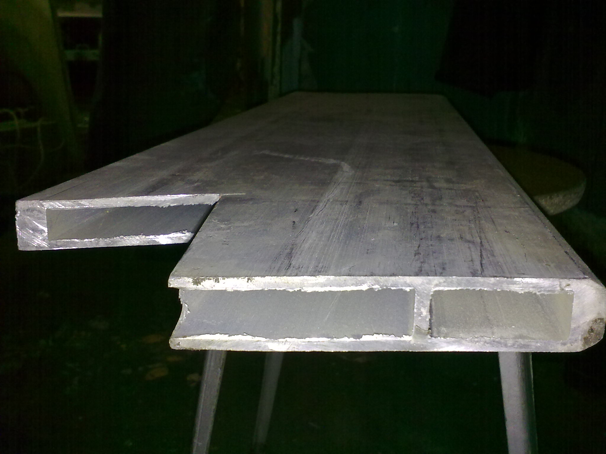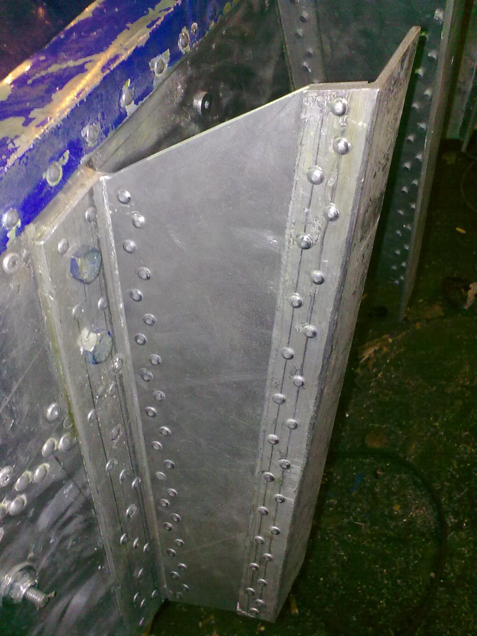 Для сборки основных, силовых, участков кронштейна использован хитрый профиль (АМГ-2 АН), как мне сказали поставщики – с подводной лодки. К этому профилю приклёпаны и приварены уголки с полкой 60мм. и толщиной стенки 6мм. (АМГ-5), они, сквозь кормовой лист, крепятся, 10-ю нерж. болтами М10, к косынкам, пришитым к стрингерам и, сквозь дубовую доску, связанны с прочными косынками, продолжающими ту же самую, силовую часть набора, только, сквозь лист рецесса. Центральная пара косынок выносного кронштейна (АМГ-6 толщиной 3мм), сквозь кормовой лист, склёпана с косынками ближних к килю стрингеров. Эти косынки имеют наклон в двух плоскостях, для обеспечения жёсткости всего кронштейна, при знакопеременных нагрузках, практически в любом направлении. Всего на сборку кронштейна ушло 196 нормальных заклёпок и 4м. сварного шва. Теперь осталось закрепить доску и зашить, снизу, промежуток между выносным транцем и кормовым листом, подпорной плитой, которая, кстати, будет являться дополнительным силовым элементом (как бы четыре косынки, в каждом из углов, только в монолитном листе), препятствующим складыванию кронштейна при боковых и диагональных нагрузках. Верхние и нижние части силовых элементов кронштейна, будут, дополнительно, оторцованы уголками, для достижения достаточной продольной жёсткости и визуальной цельности. По окончанию отпишусь и выложу все фотографии.