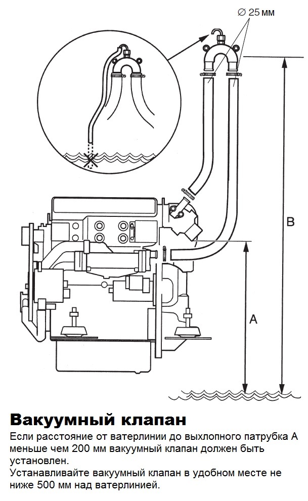 Если Вы знаете, что такое "мокрый" выхлоп, то при установке двигателя ниже ватерлинии, точнее если выпускной коллектор стоит ниже ватерлинии, то нужно размыкать контур забортной воды, чтобы после останова двигателя не продолжался ток воды по забортному контору. Т.к. вода будет наполнять выхлопную систему и в конечном итоге попадет в выпускной коллектор. Нужно либо сразу закрывать кран кингстона, либо ставить так называемый вакуумный клапан. При падении давления в забортном контуре после останова двигателя клапан открывает пружинка, при пуске двигателя его запирает поток воды. На данном катере просто установили тройник и часть воды выходит не с выхлопными газами, а сразу через борт над ватерлинией. Иногда так делают для успокоения души, дабы наблюдать, что забортная вода поступает и система охлаждения работает. Хотя все двигатели TDME снабжены аварийной лампой перегрева со звуковой сигнализацией.