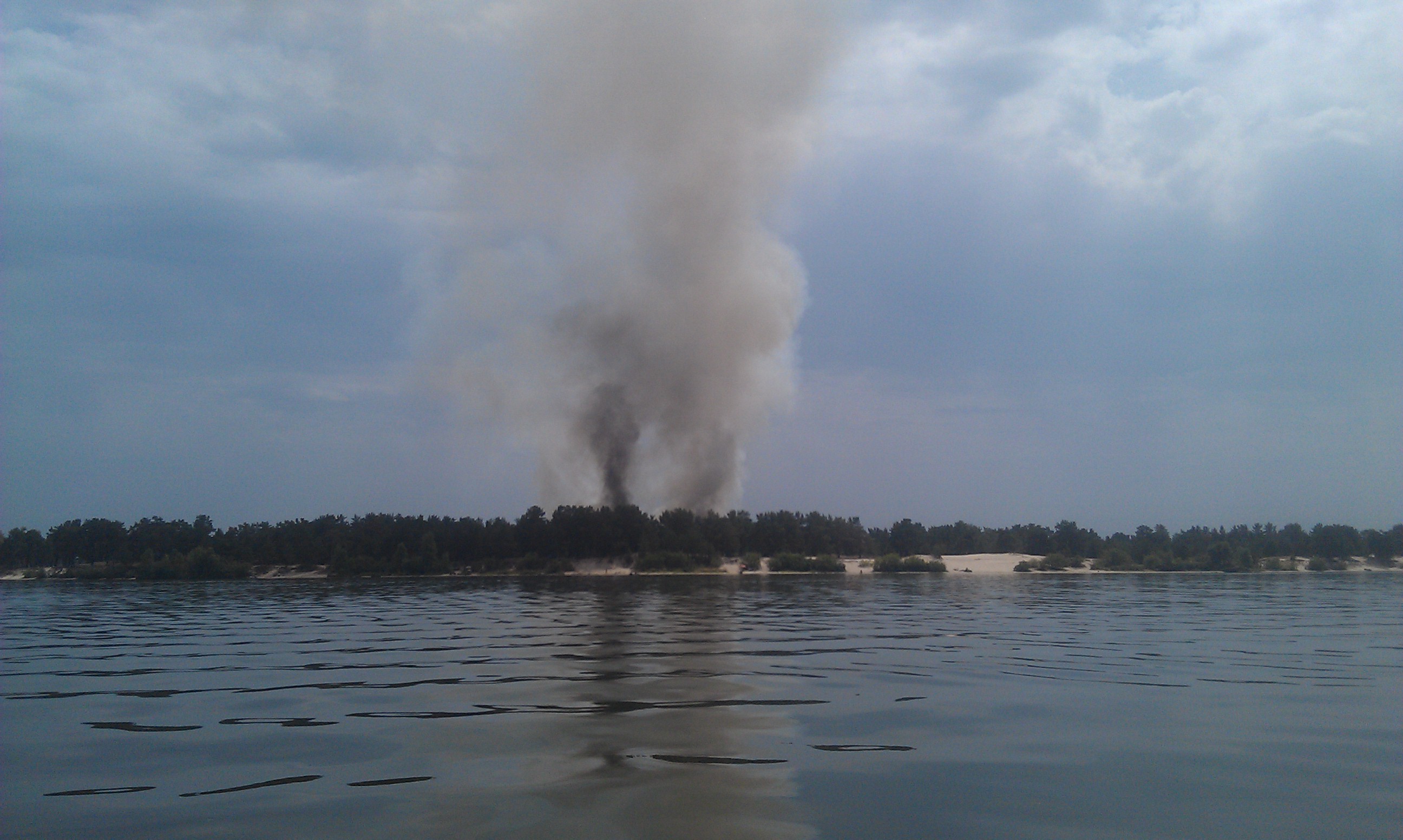 Ходили на заправочку - дым был уже совсем вроде недалеко от Вышгородской стороны, думали может людей оттуда надо помочь вывозить, но посмотрели, отдыхающие прям под дымом - не парятся вообще, палатки не сматывают, ну мы и уехали...