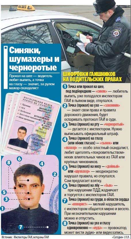 «Тайные пометки на правах и талонах предупреждений в ГАИ ставили еще со времен СССР, актуальны они и сейчас. Опытный инспектор, знающий «тайный язык» точек, без долгого общения с нарушителем ПДД заранее знал, чего от него можно ожидать. «Шифр» прост — пометка на лбу всегда обозначала, что водитель будет «бодаться» — жадничать, но деньги на лапу все равно даст, — откровенничает ветеран ГАИ Игорь Большаков, — а пометка или проколотые тоненькой иголочкой глаза означают «сынка» или «мажора» — такие любят скандалить и звонить всяким высоким покровителям. У «сынков» в основном взяток не берут, а сразу пишут протокол». Свои тайные значения имеют пометки на разных частях водительской фотографии. Как правило, тайные знаки появляются на правах после недолгого общения с инспектором на дороге. «Большинство «ксив» «наши» не помечают за ненадобностью — нормальные люди сами знают свою вину и не доводят дело до протокола, давая «воздух» (взятку), — признался сотрудник одесского ГАИ Алексей, — а пометки на правах ставят тем, кто не хочет «решать вопрос» на месте. Я помечаю права за секунду-другую, если нарушитель начинает скандалить.