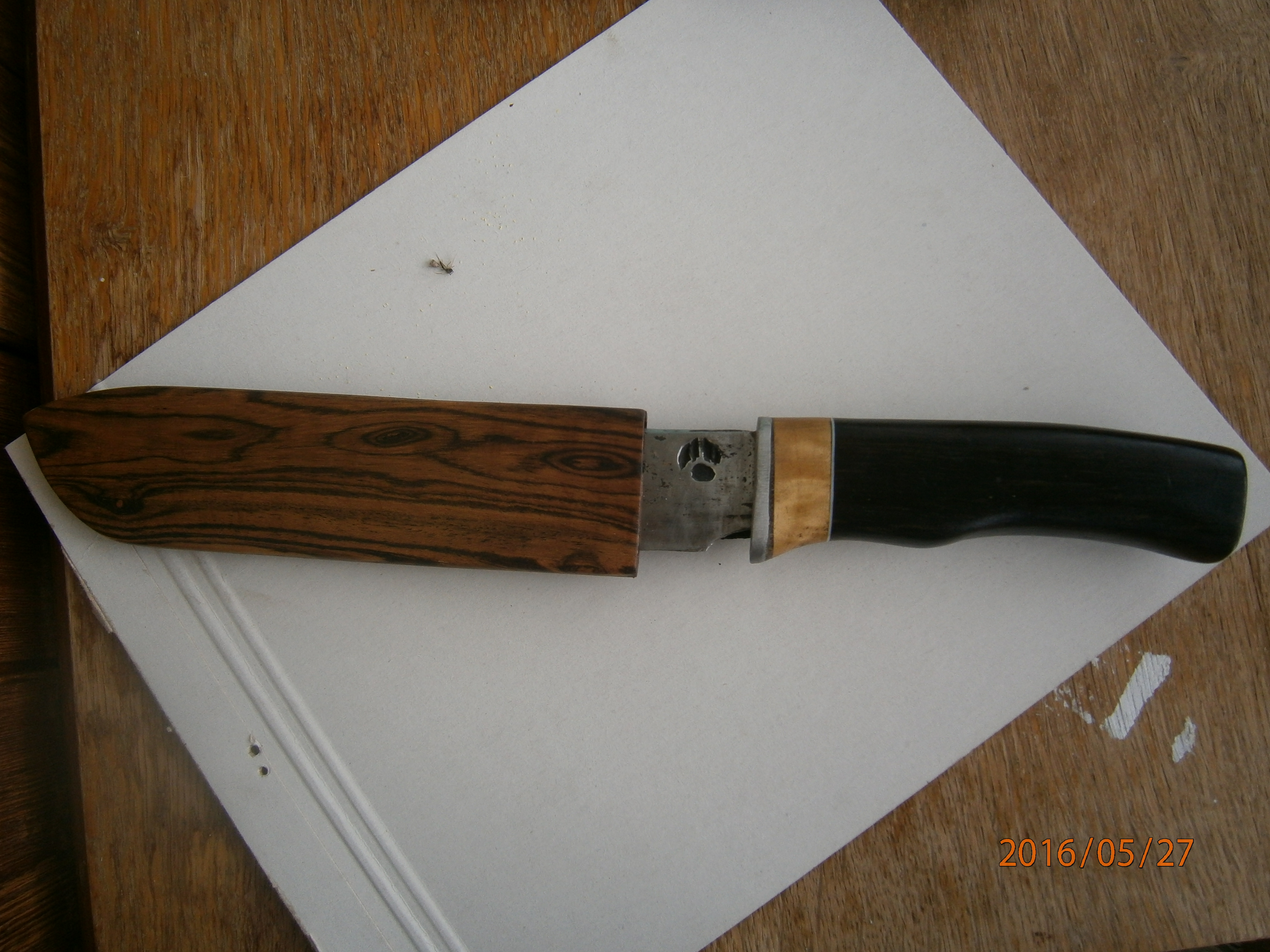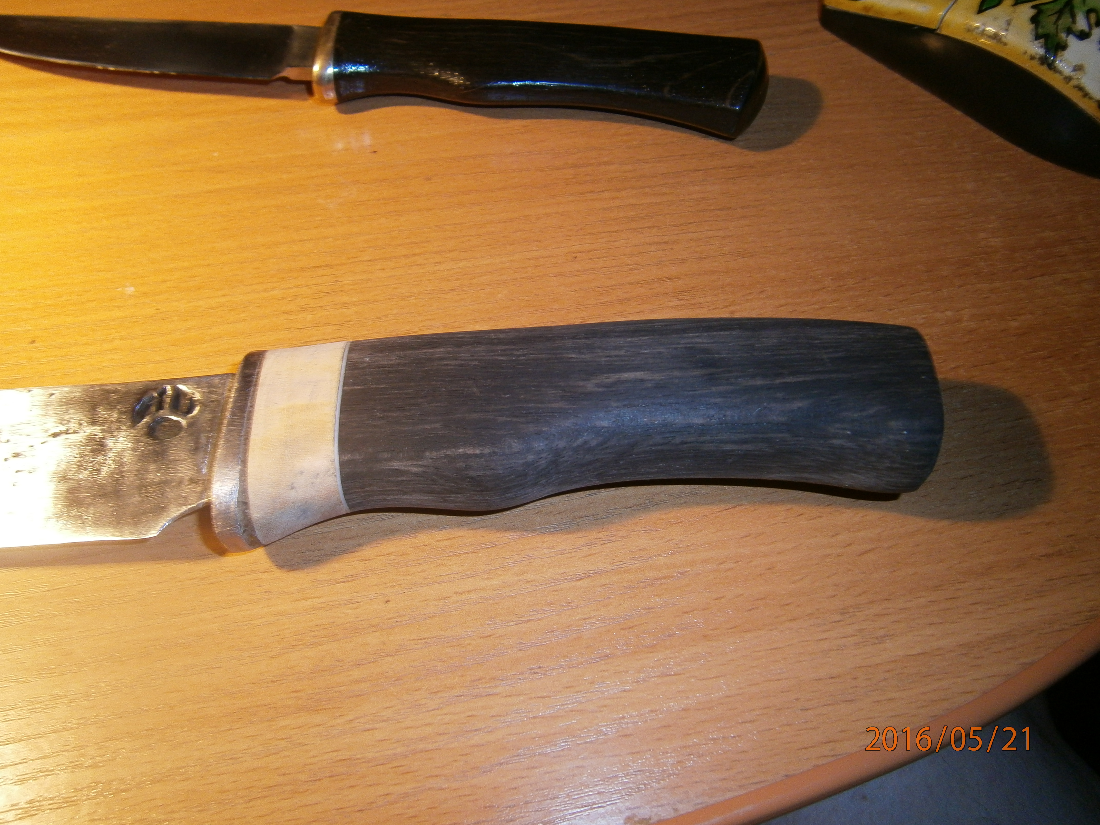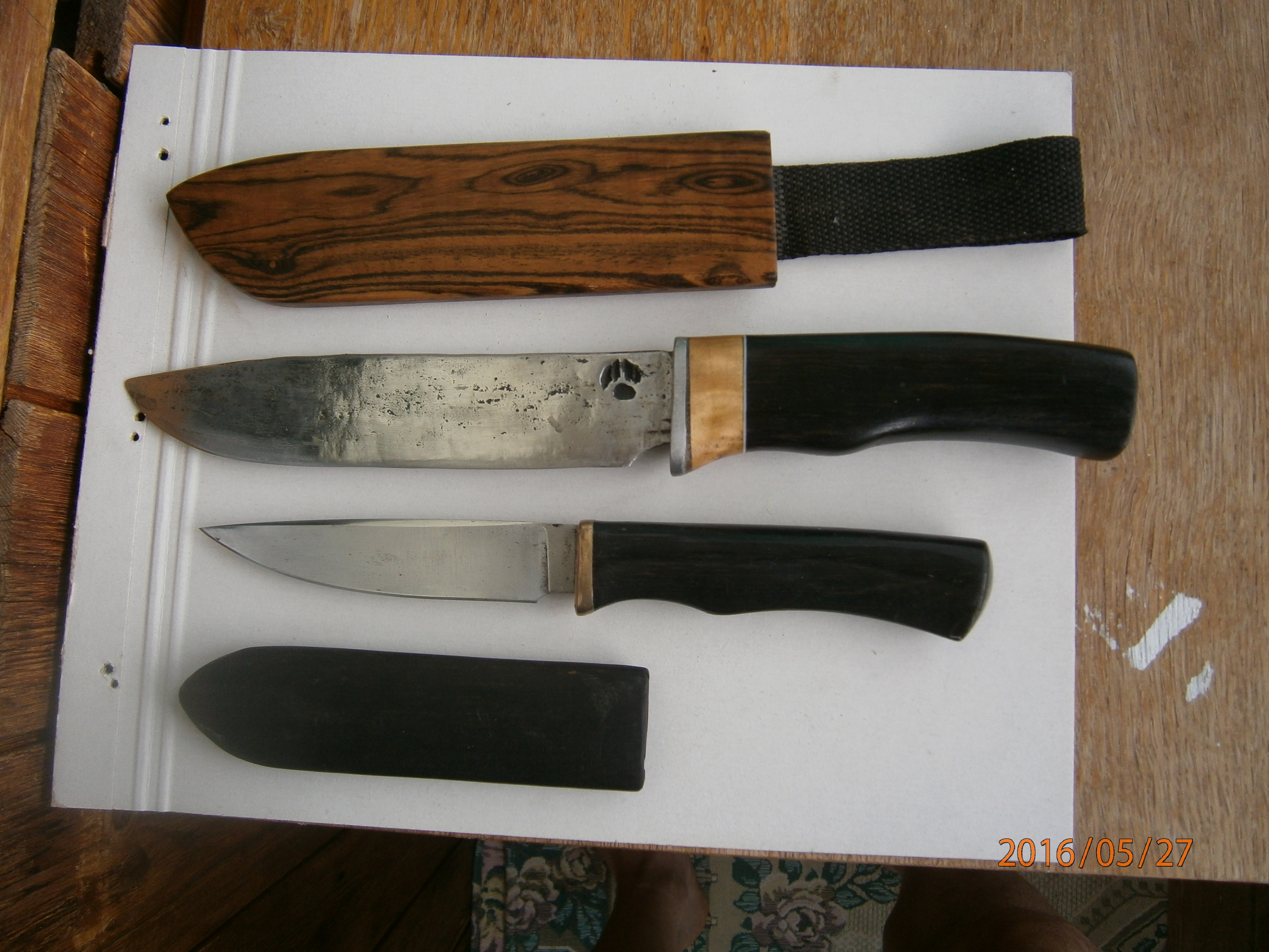 Обновлю темку Большой выковали по моей просьбе из рессоры моего мотора Нептун 23.сталь или 98х18 или 95х18, на клинке клеймо мастера,ручка и чехол из экзотических деревях, малый 40х13, ручка морёный дуб. чехол чёрное дерево