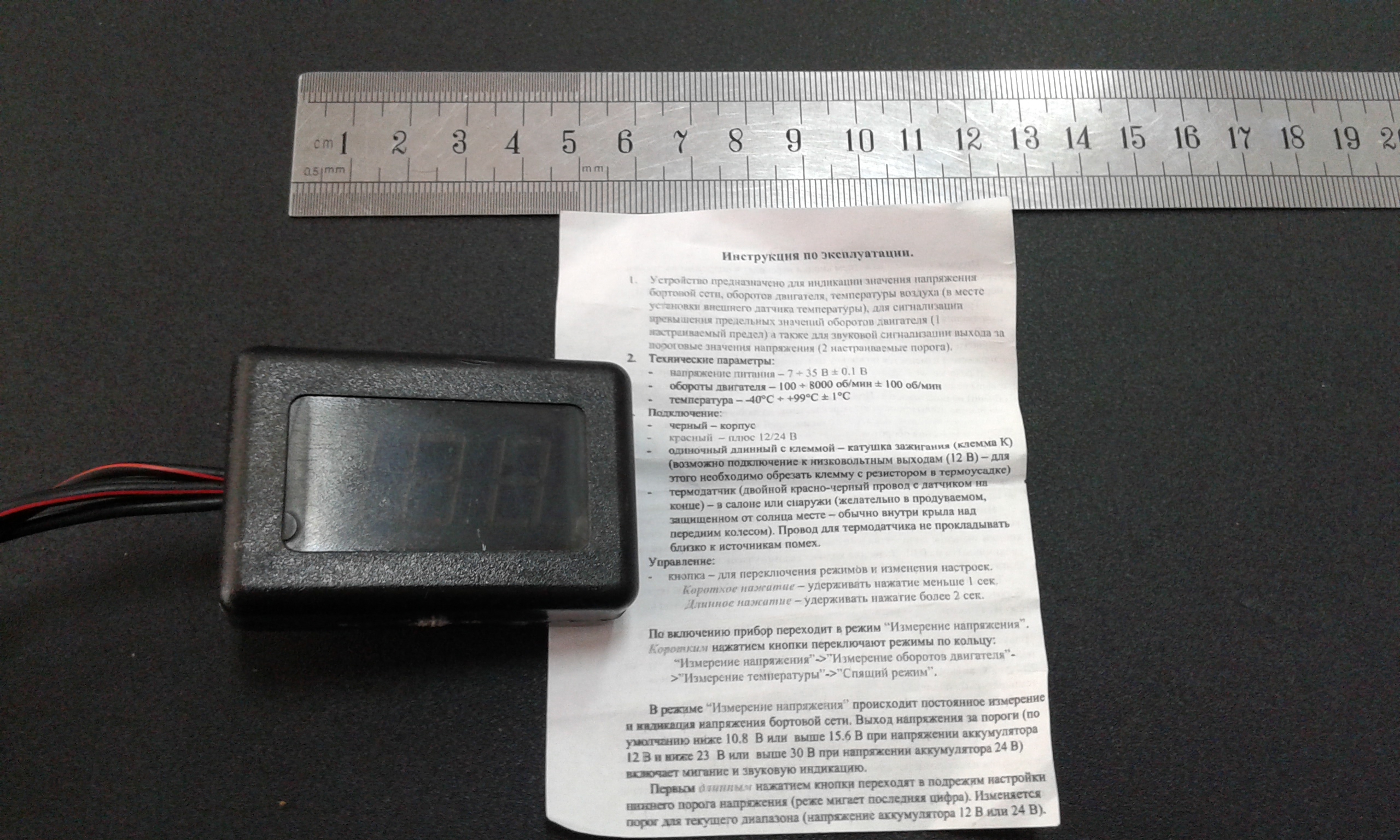 Вот такой прибор, из инструкции: Устройство предназначено для индикации значения напряжения бортовой сети, оборотов двигателя, температуры воздуха (в месте установки внешнего датчика температуры), для сигнализации превышения предельных оборотов двигателя (1 настраиваемый предел), а также для звуковой сигнализации выхода за пороговые значения напряжения (2 настраиваемые порога).