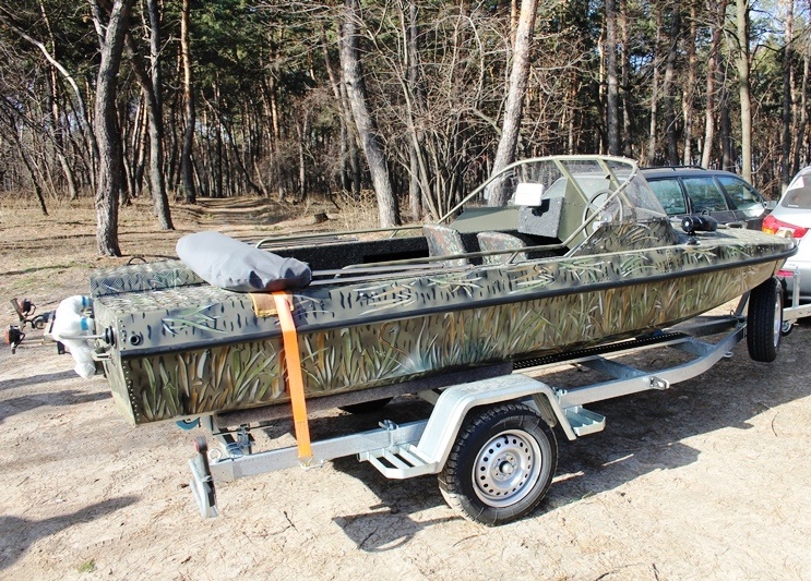 Корпус был очищен от старой краски, проверен на течь и состояние заклёпок (подуставшие заменены), обработан кислотным грунтом по алюминию + качественно покрашен и вскрыт матовым лаком. Верх лодки усилен рифленкой, установлен привальный брус, так же качественно усиленны задние рундуки и люк (можно спокойно по ним ходить), стекло с форточкой, двухконсольная торпеда со ступенькой, салон из влагостойкой фанеры + влагостойкий ковролин, бардачки в бортах, передние поворотные сидения с рундуками, задний съёмный диванчик-рундук (крепится на н/ж барашках+ н/ж усиленных закладных) можно комфортно ночевать и рыбачить «негабаритным людям», изготовлен самоотливной-выносной транец под 508 ногу мотора, качественно усилен и завязан на продольные и поперечные рёбра жёсткости, скоба для затяжки на лафет. Тент из итальянской яхтенной ткани с н/ж дугами и качественной фурнитурой. Качественно проведена электрика, все приборы на предохранителях… установлены все необходимые приборы (панель переключения приборов, розетки прикуривателей, эхолот, блок предохранителей, мульти-тахометр, датчик уровня топлива и многое др.), рулевая система, усилены места под транцевые плиты, встроенный топливный бак на 54 л..