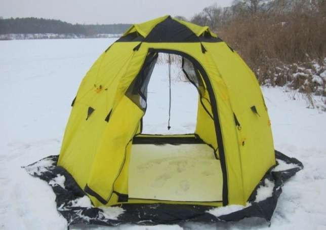Снизу, по периметру палатки – снегозащитная юбка – полог. Для надежного закрепления палатки на льду используется прилагаемый комплект растяжек и крючков.