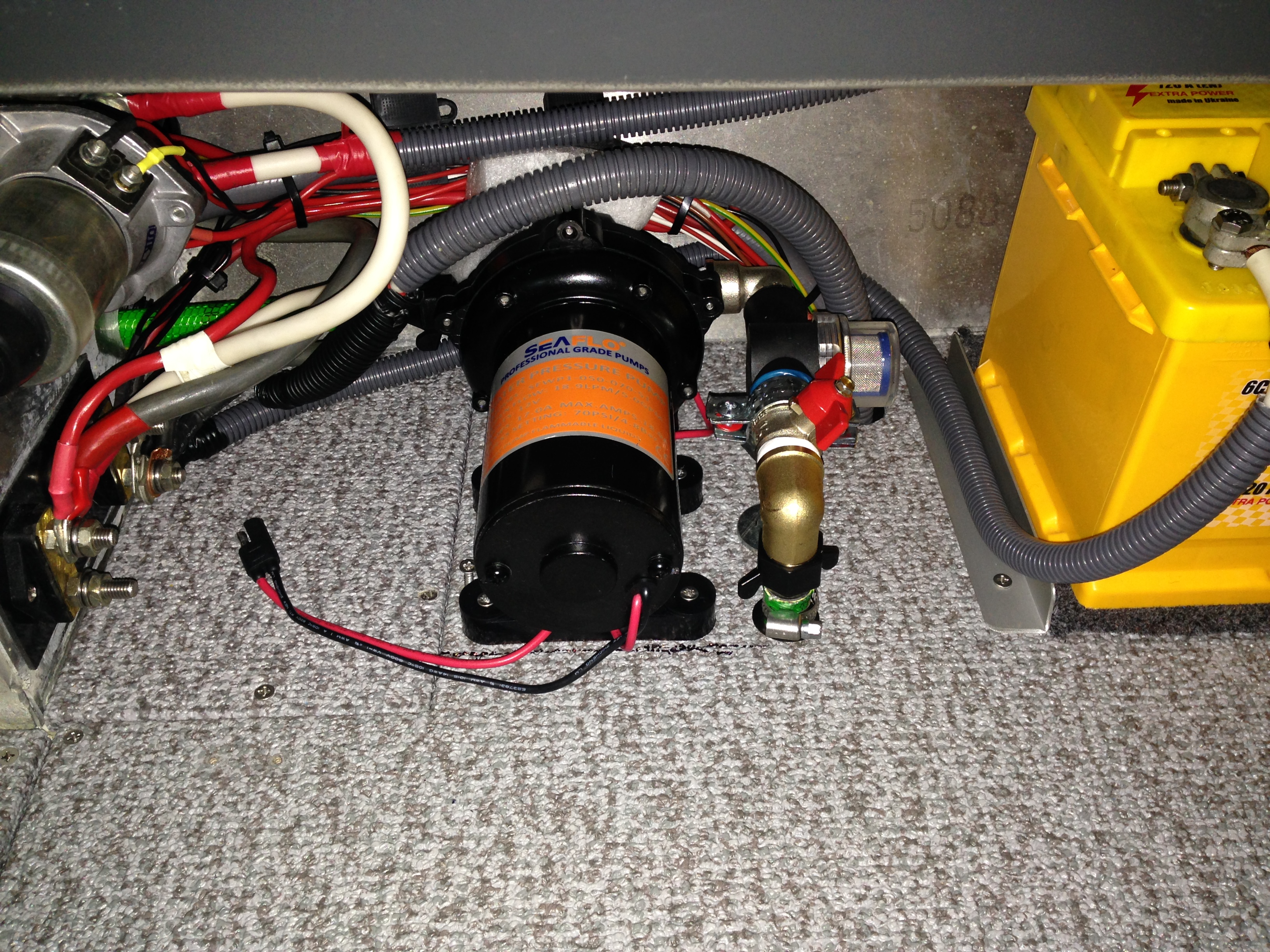 Установил насос в нишу, возле аккумулятора. Примерял и под полом, место есть, но обслуживать неудобно.
