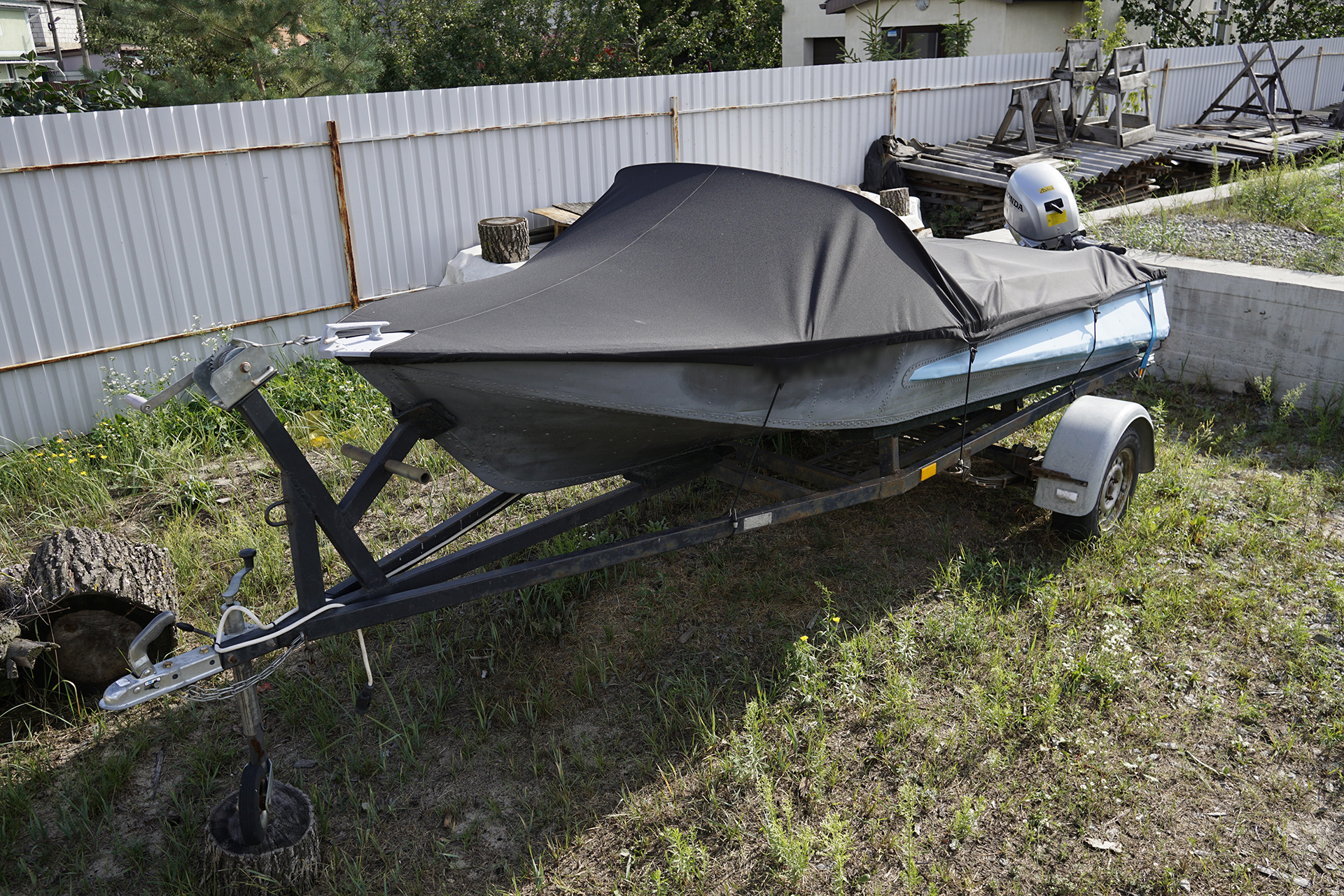 Лафет: самодельный, из квадратной трубы 60*40*3мм, новые усиленные рессоры от Москвич, амортизаторы Ford Sierra, ступицы и балка Ford Escort. Ступицы в прошлом году проверялись - абсолютно герметичны. Лебедка, панель габаритов съемная, упор для ноги мотора. Прицеп идет очень мягко - с торсионом ни в какое сравнение.