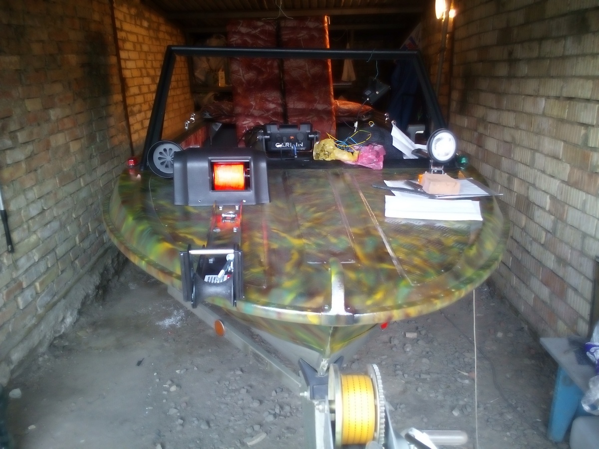 И дальше по накатанной. Примерял лебедку и роульс, прибил. Осталось электрику подключить, но у меня это проще. Я давно прокинул провода "+" и "-" сечением 10мм от акумма на колодки под торпедо. Так же были прибиты и подключены гудок и фонарь. Подключил переднюю помпу и проверил - качает зараза прошлогоднюю воду которую забыл слить, вонючая%). Еще стекла новые поставить да по мелочам, пропылесосить, накачать запаску и на воду