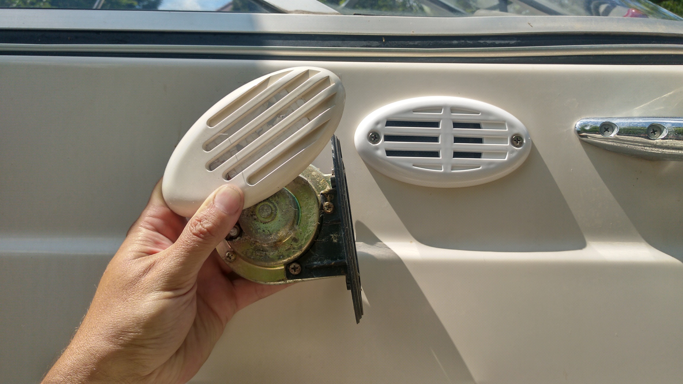 Вытащил нерабочую бибикалку, понял что чинить там нечего и купил такую же новую за 600 грн., ибо эти сигналы, как и решетки вентиляции, выносные датчики помп откачки, навигационные огни - стандартных размеров, продаются везде и становятся в любой бэй\сирэй до 30 футов.