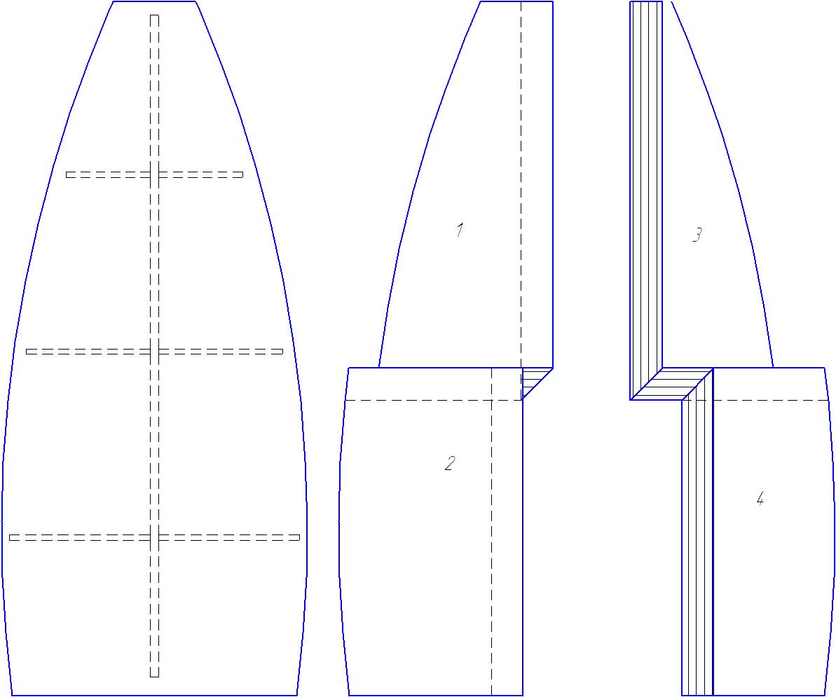 нужно сделать полностью и подогнать по месту и уж только потом их клеить прямо внутри лодки. Сначала 1 и 2, потом 3 и 4 лишь потом по килю и к килю две получившиеся части, крепя их к килю шурупами, которыми и сжимая заусовку. 1 и 2, как и 3 и 4 можно сжать струбцинами между собой навесу, можно саморезами, которые потом убрать. Думаю алгоритм понятен.