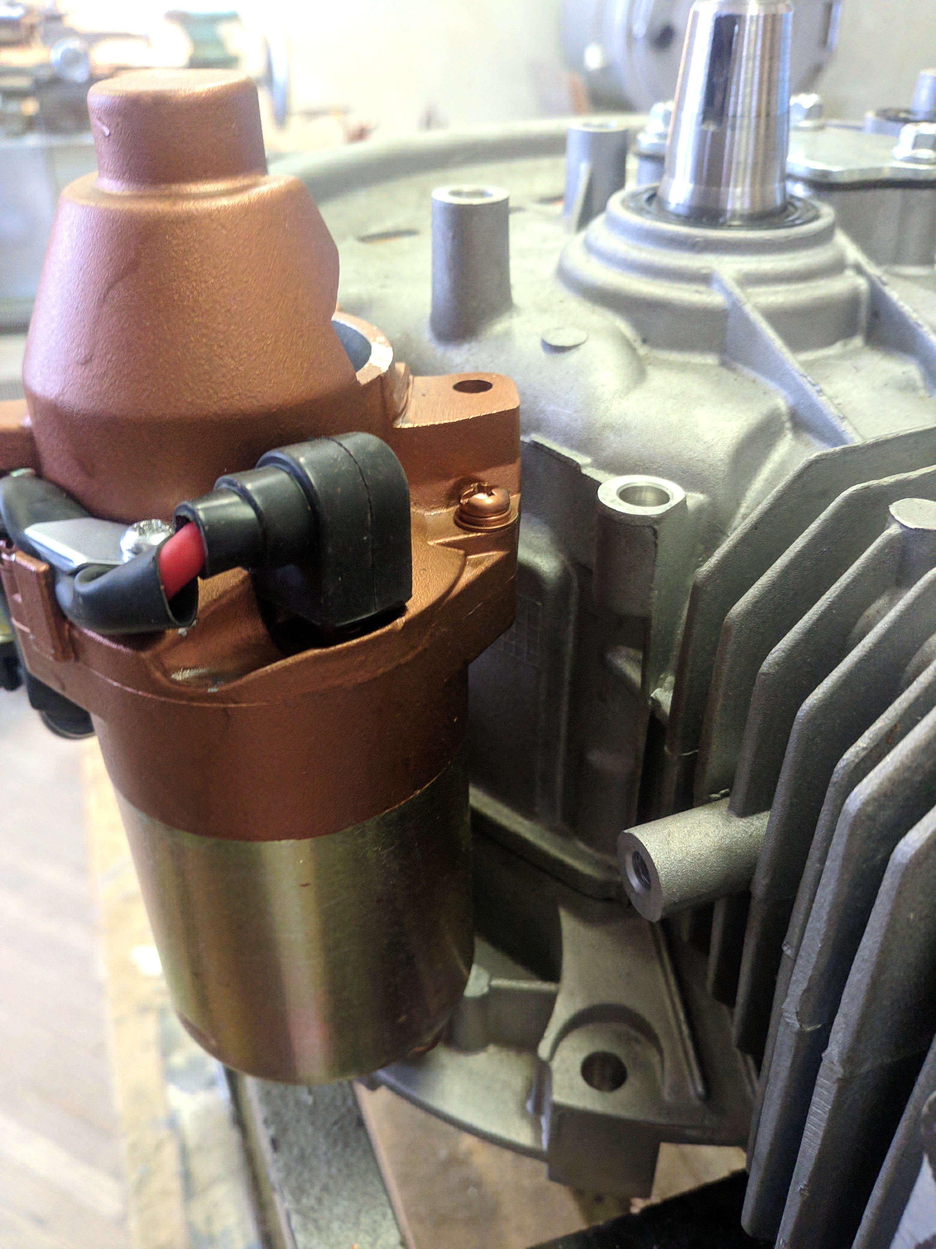 Электростартер на блок G200V. На блоке есть крепление под какой-то стартер. Родного не нашлось даже в теории, хотя он как-бы должен существовать (крепления зачем-то делали?). По габаритам подходит китаец от F168, от него же и маховик с зубчатым венцом и магнитами внутри для генератора. К сожалению, стартер становится только на левое ухо (на правое не получается, мешает корпус картера), закрывая горловину для масла. Придется переделывать, хотя, все равно под колпаком мотора штатная, как пятая нога кобыле. Правое ухо на стартере придется удлиннить до крепления на картере.