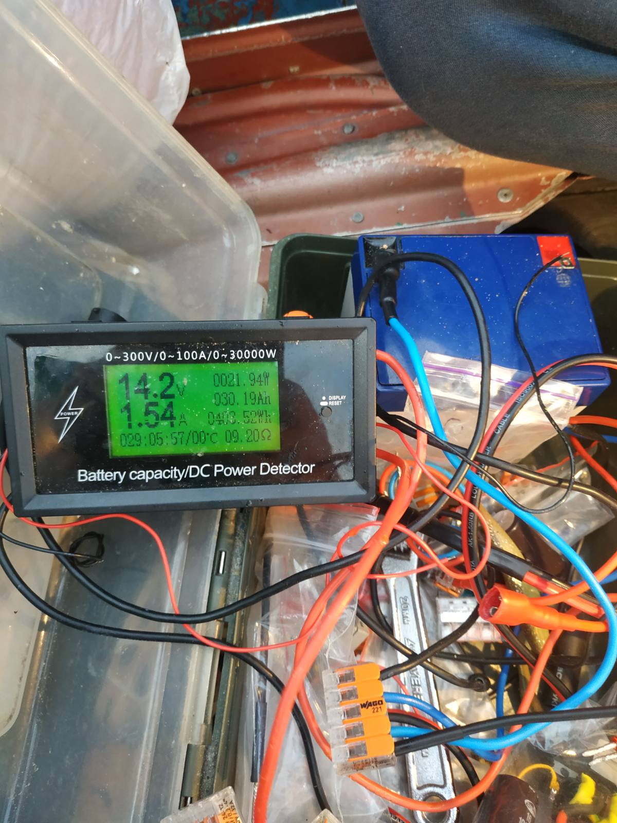 При добавлении оборотов, газа(примерно 1/4-1/3) 56-60ватт без просадки напряжения ниже 14,1-14,2В. На фото питание только от мотора , клеммы с АКБ сняты.
